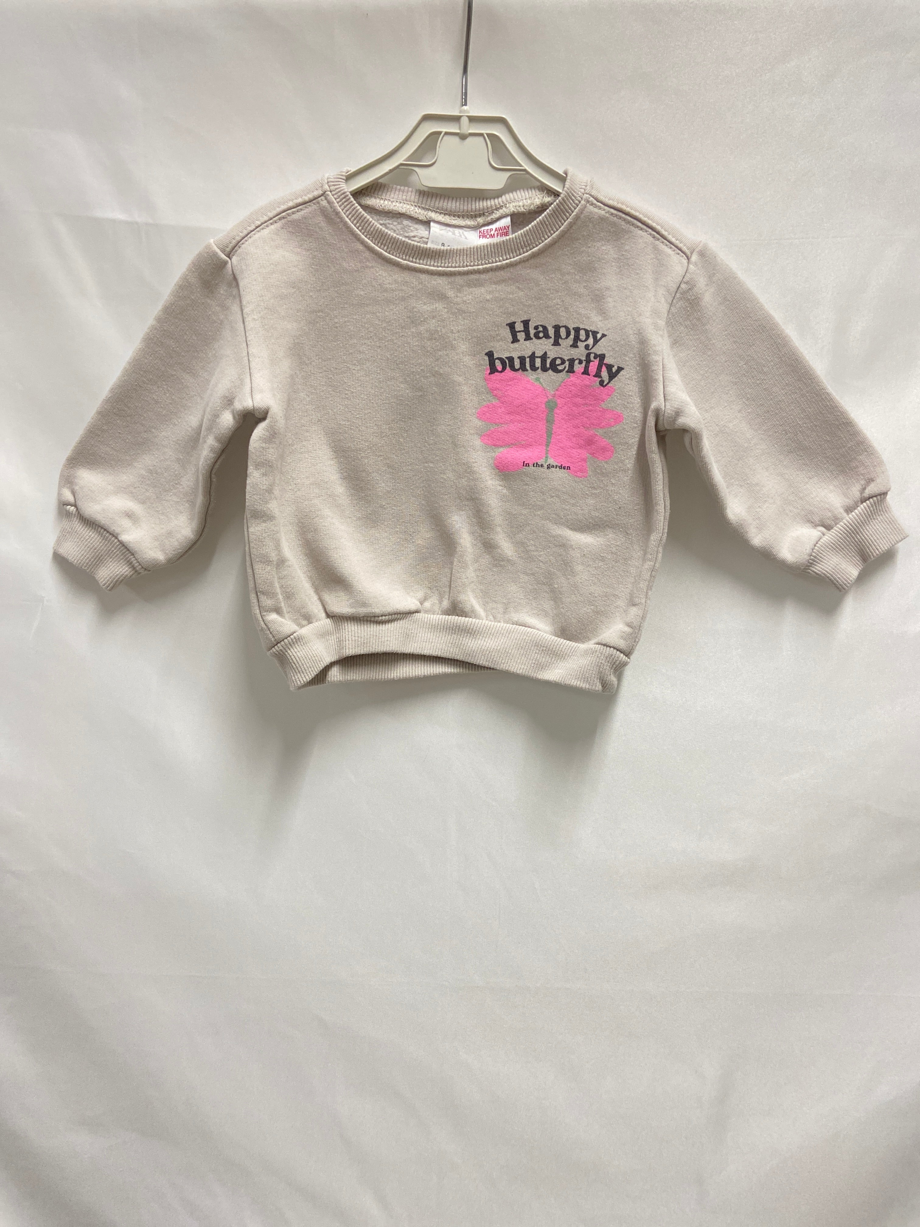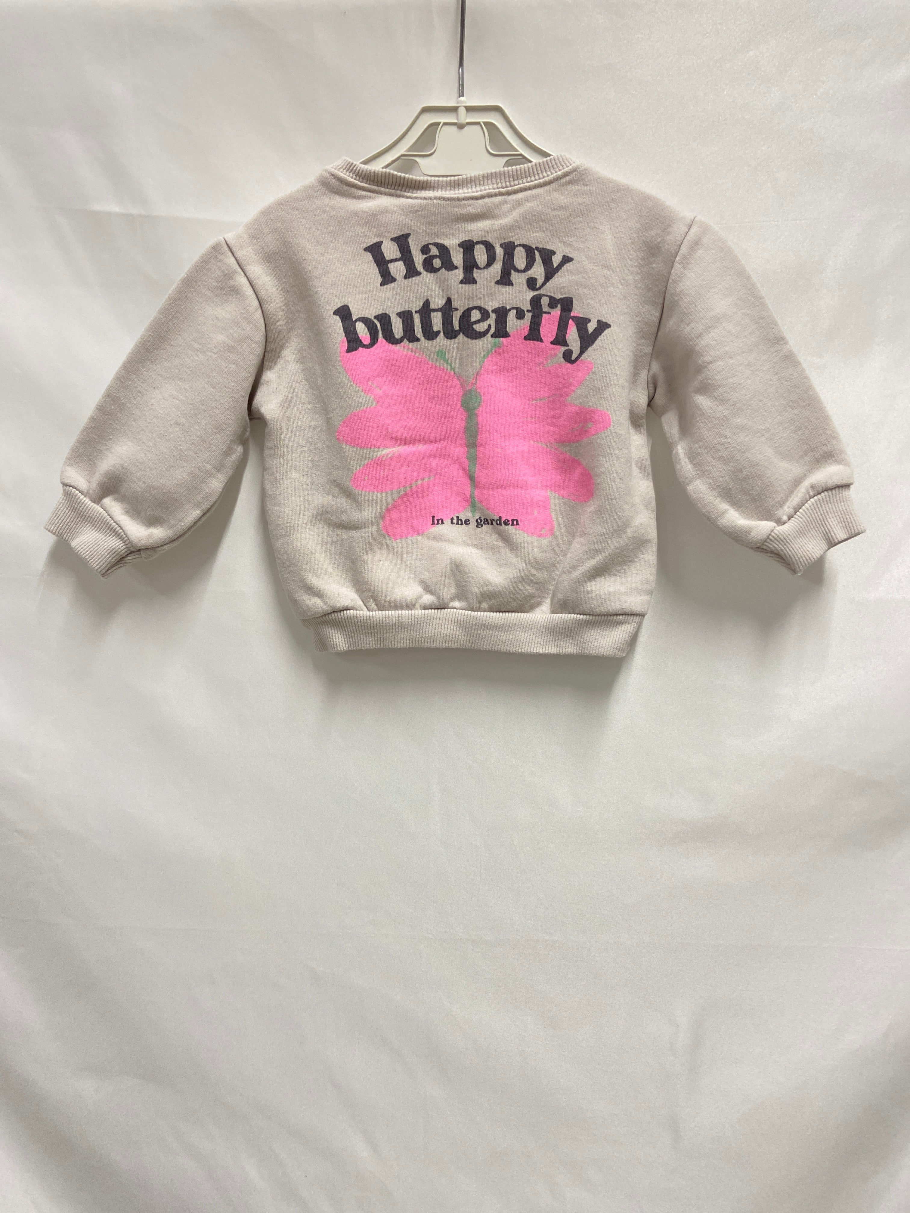 Questa adorabile felpa in tonalità beige è perfetta per le piccole sognatrici! Realizzata in un caldo cotone, offre comfort e morbidezza. Sul davanti, un'incantevole farfalla rosa insieme alla scritta "Happy butterfly" porta un sorriso immediato. Le maniche lunghe e il taglio a cinque ottavi la rendono ideale per le giornate più fresche, perfetta per giocare e divertirsi. Leggermente usata, ma in ottime condizioni, è un capo versatile che si abbina facilmente a pantaloni o gonne. Un must-have per ogni piccola fashionista!