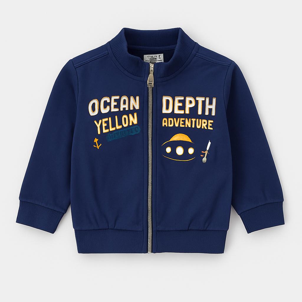 Questo caldo e avventuroso giubbotto blu scuro è perfetto per i piccoli esploratori! Con una comoda zip e maniche lunghe, è ideale per le giornate fresche. Decorato con simpatiche scritte “OCEAN DEPTH ADVENTURE” e un'adorabile grafica di un sommergibile, questo capo stimola la fantasia. Realizzato in morbido cotone, offre comfort e libertà di movimento. Anche se usato, è in ottime condizioni e pronto per accompagnare il tuo bimbo nelle sue avventure quotidiane! Un must-have per ogni piccolo amante del mare e della scoperta!