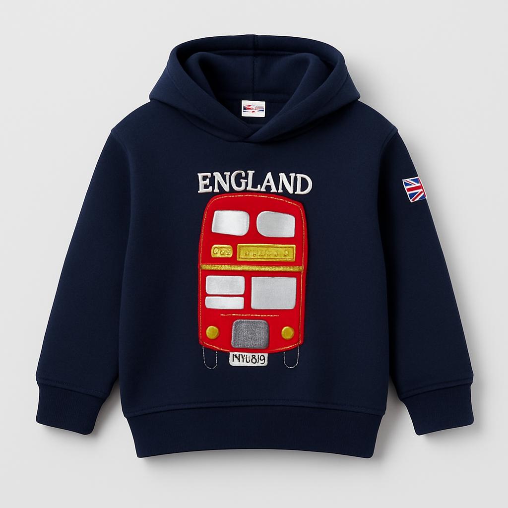 Questo adorabile felpa con cappuccio è perfetta per i piccoli viaggiatori! Di un elegante blu navy, è decorata con un originale design che rappresenta un tipico autobus rosso di Londra, con l’efficace scritta "ENGLAND". Realizzata in un morbido cotone, offre calore e comfort durante le fresche giornate. Le finiture colorate e il dettaglio della bandiera britannica sulla manica aggiungono un tocco di avventura. Perfetta per l'uso quotidiano o le passeggiate in famiglia, sarà un capo amato nel guardaroba! Anche se usata, è in ottime condizioni e pronta a far brillare il look del tuo bimbo!