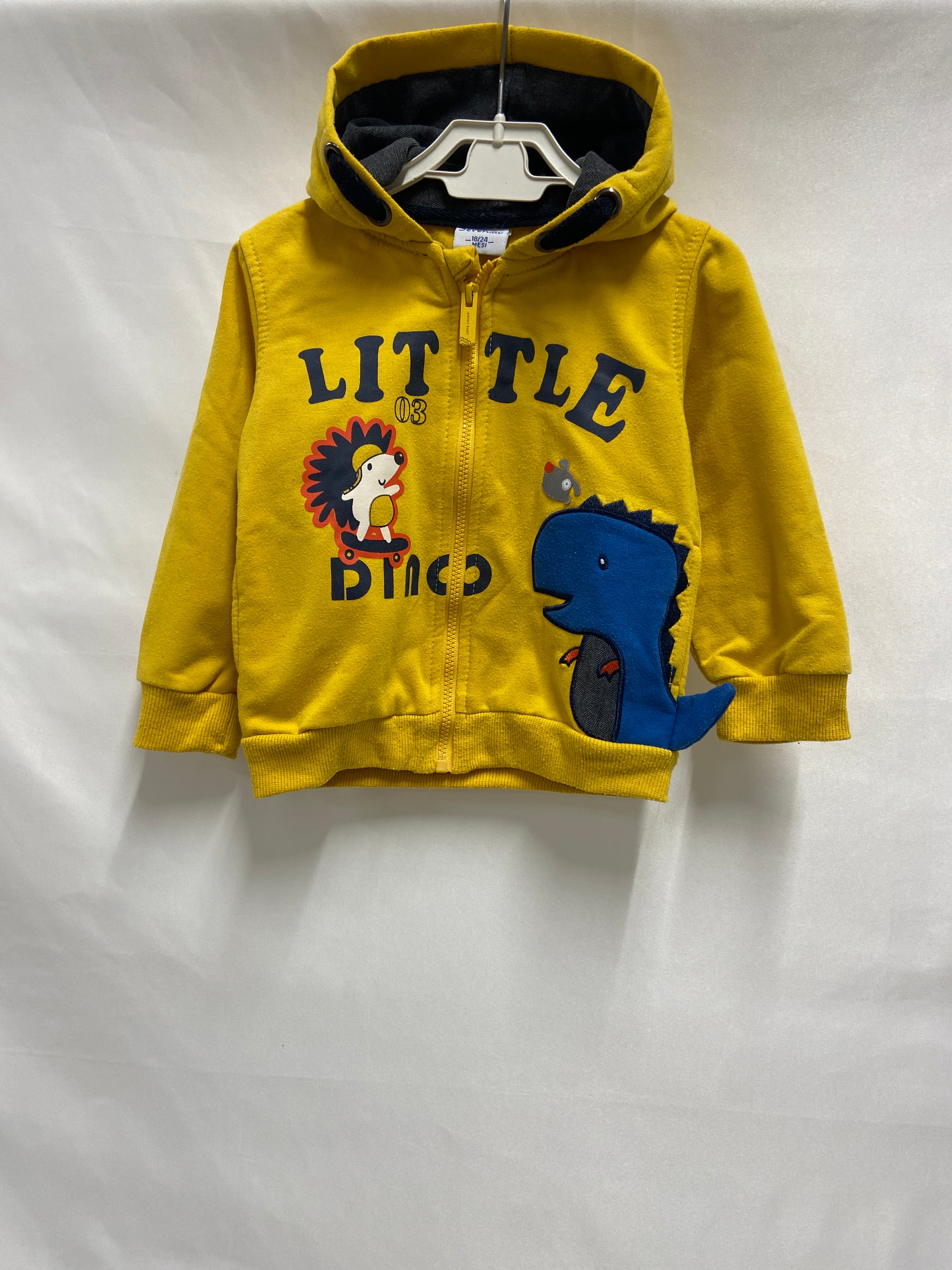 Questo adorabile cardigan giallo con cappuccio è perfetto per i piccoli esploratori! Realizzato in morbido cotone, offre calore e comfort. Sul davanti si distingue per le divertenti applicazioni di un riccio e un dinosauro che catturano subito l'attenzione. La scritta "LITTLE DINO" aggiunge un tocco di avventura e fantasia. Le maniche lunghe lo rendono ideale per le fresche giornate primaverili o autunnali, perfetto per giocare in libertà. Nonostante sia un capo usato, è in ottime condizioni, pronto a diventare il favorito nel guardaroba del tuo bimbo!