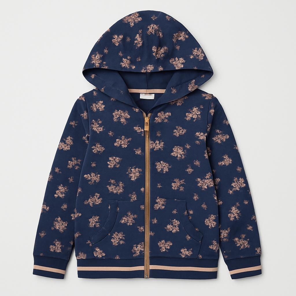 Questa meravigliosa felpa è perfetta per le piccole esploratrici! Realizzata in morbido cotone, presenta un delizioso motivo floreale su sfondo blu scuro, che la rende un capo elegante e trendy. Con una comoda zip frontale e un cappuccio pratico, è ideale per le giornate fresche o per un look casual. Le tasche frontali sono perfette per riporre piccoli tesori. Nonostante sia un capo usato, si presenta in ottime condizioni, pronta a diventare l'alleata perfetta per le avventure quotidiane! Un must-have per il guardaroba di ogni bambina!