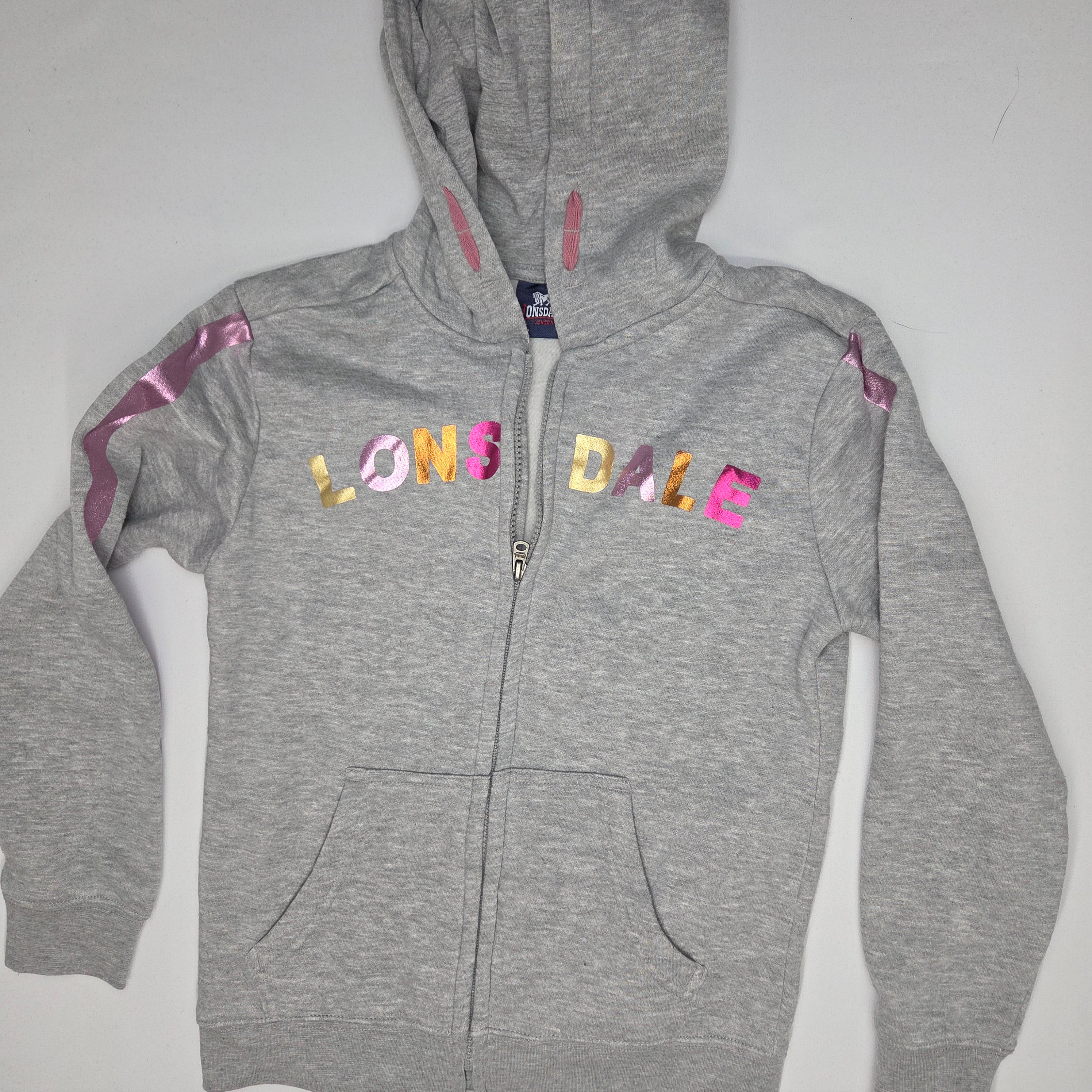 Questo splendido felpa grigia di Lonsdale è perfetta per le piccole avventuriere! Realizzata in morbido cotone, offre comfort e calore durante le giornate fresche. La zip frontale facilita l'indossarla, mentre il cappuccio aggiunge un tocco sporty e pratico. La scritta “LONSDALE” colorata sul davanti cattura l'attenzione con eleganza. Le strisce rosa lungo le maniche conferiscono un dettaglio trendy e vivace. Nonostante sia un capo usato, si presenta in ottime condizioni e rappresenta un'aggiunta divertente e alla moda per il guardaroba dei bambini!