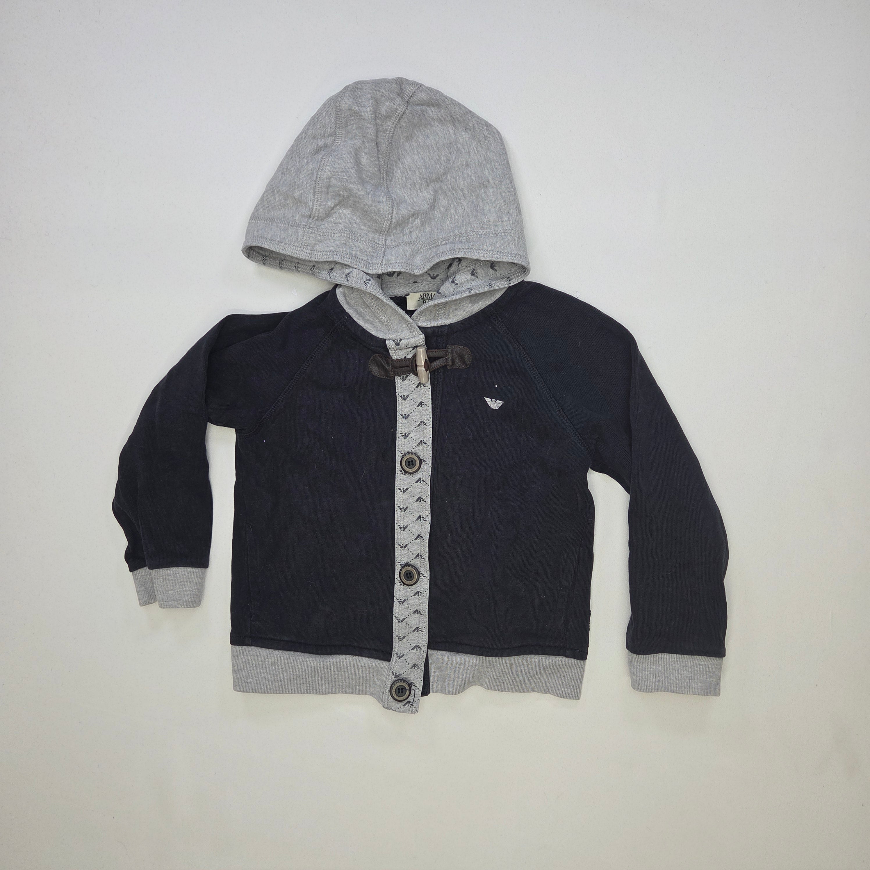 Questo adorabile cardigan di marca Armani Junior è perfetto per mantenere il tuo piccolo al caldo con stile! Realizzato in un morbido misto cotone, gioca con tonalità di blu scuro e grigio chiaro, mentre il dettagliato colletto con cappuccio e i bottoni frontali aggiungono un tocco di eleganza casual. Le maniche lunghe garantiscono comfort e calore, ideali per le fresche giornate di autunno o primavera. Nonostante sia un capo usato, si presenta in ottime condizioni, pronto per accompagnare ogni avventura del tuo bambino. Un must-have per ogni piccolo esploratore, che ama sentirsi alla moda mentre si gode il mondo!
