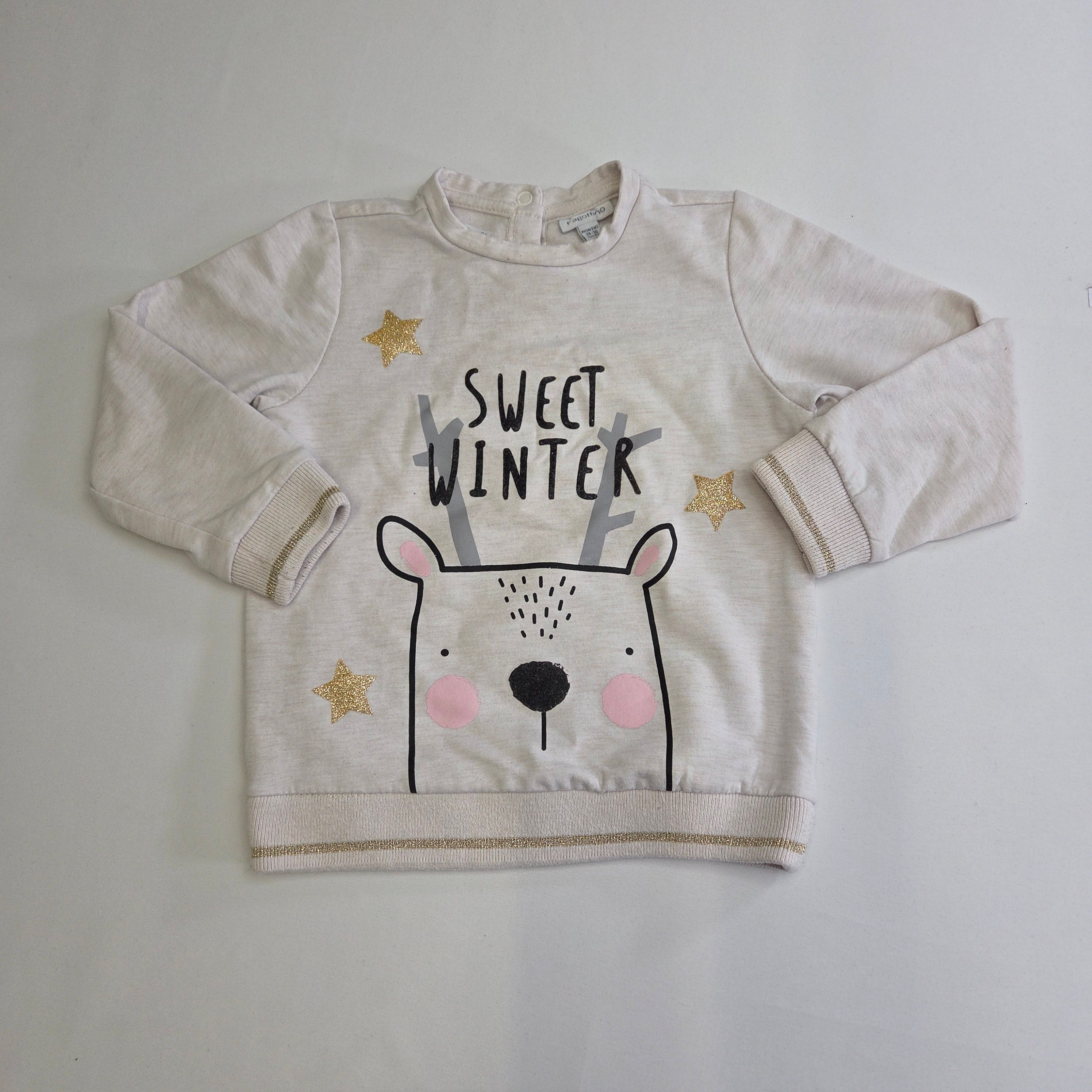 Questo adorabile maglione in tonalità chiara è perfetto per le fresche giornate invernali! Decorato con un tenero viso di un'alce e la scritta "Sweet Winter", porta un sorriso sul viso di ogni bambino. Le stelle dorate aggiungono un tocco brillante e giocoso, rendendolo ideale per outfit festivi o semplicemente per coccolarsi a casa. Le maniche e il bordo sono rifiniti con dettagli a contrasto, per un fascino extra. Nonostante sia un capo usato, è in ottime condizioni e pronto per accompagnare le avventure invernali del tuo piccolo!
