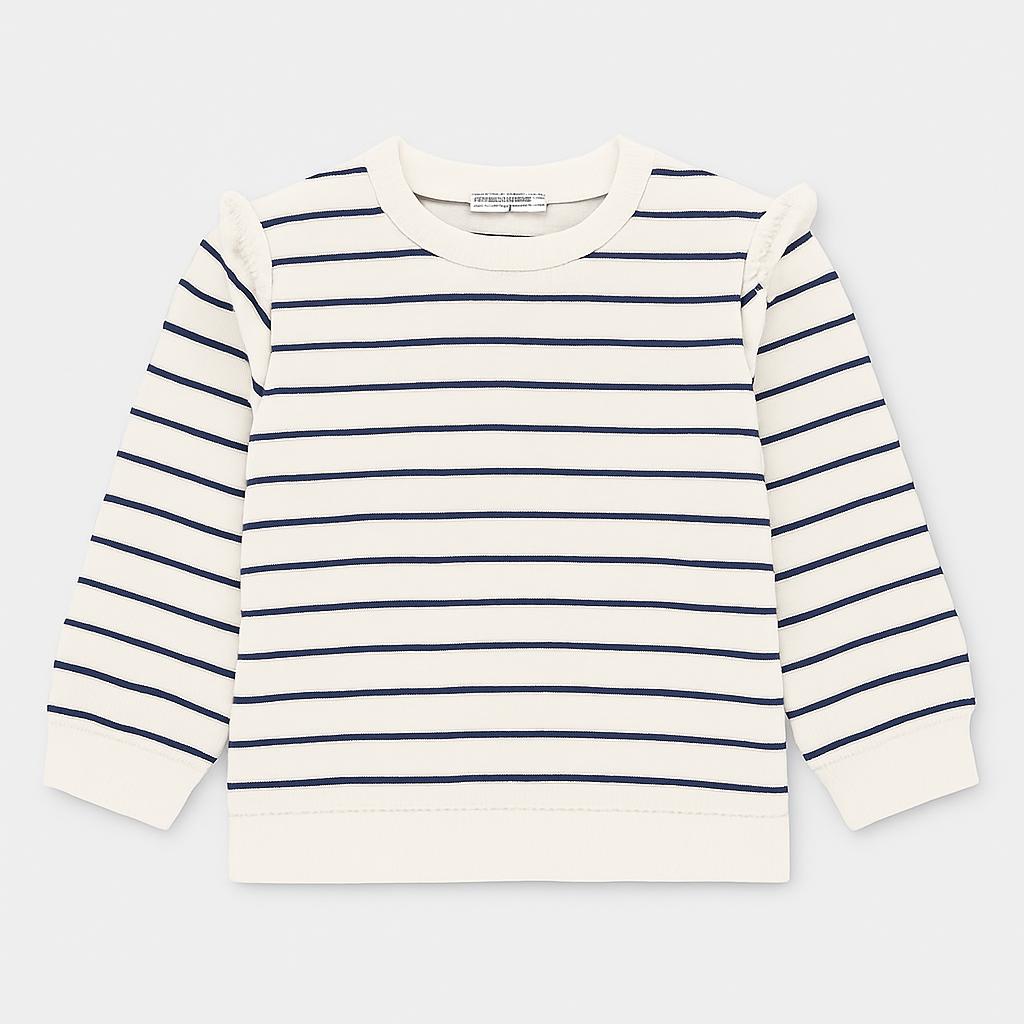 Questo adorabile maglione a righe è il perfetto alleato per le giornate fresche! Realizzato in morbido cotone, è caratterizzato da una base bianca con righe navy, che dona un tocco di eleganza e freschezza. Le spalline arricciate aggiungono un adorabile dettaglio femminile, rendendolo unico e alla moda. Con le sue maniche lunghe, è ideale per un look casual e confortevole. Nonostante sia un capo usato, si presenta in ottime condizioni, pronto per essere indossato da una piccola trendsetter! Perfetto per l'uso quotidiano oppure per occasioni speciali, questo maglione sarà un must nel guardaroba di ogni bambina.