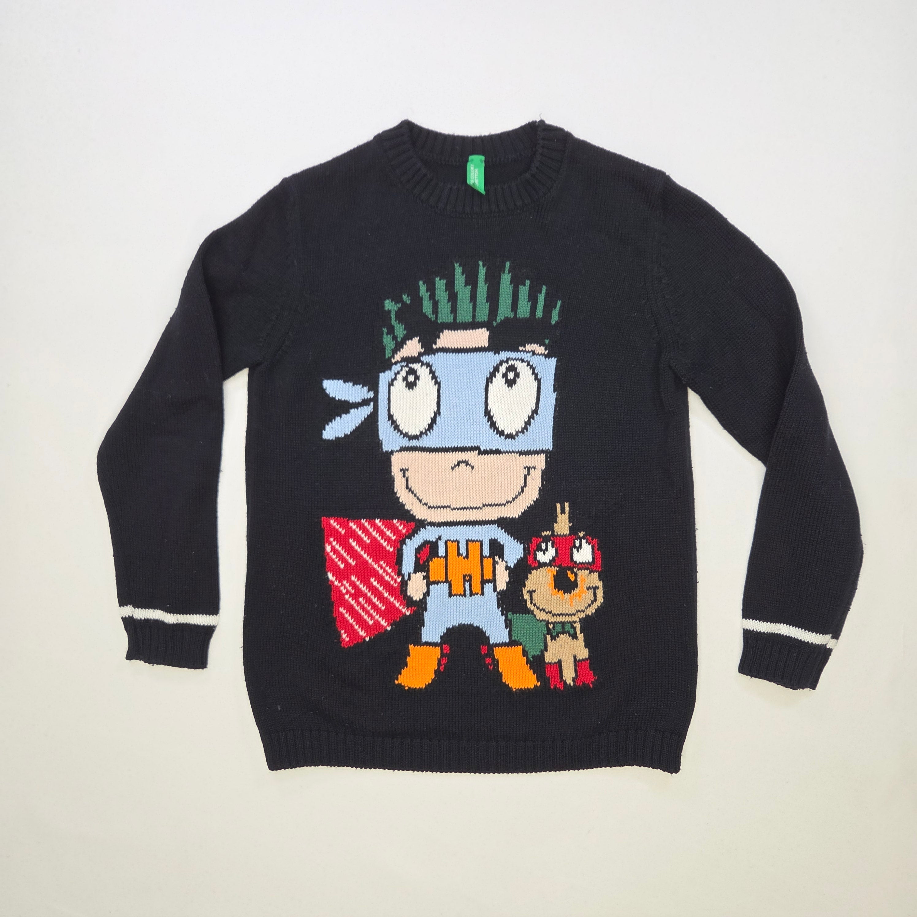 Questo adorabile maglione da bambino, di un vivace blu notte, è perfetto per i piccoli supereroi! Realizzato in morbido filato, presenta un divertente motivo sul davanti di un simpatico supereroe e il suo fedele amico. I colori brillanti e i dettagli curati, come le maniche con bordi bianchi, rendono questo maglione un capo unico e trendy. Ideale per tenere caldi i tuoi bimbi nelle fredde giornate invernali, è perfetto per giochi all'aperto o per una giornata in famiglia. Anche se utilizzato, è in ottime condizioni e pronto per una nuova avventura! Non lasciarti sfuggire l'occasione di rendere il guardaroba del tuo bambino ancora più speciale!