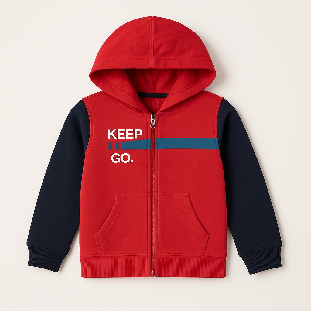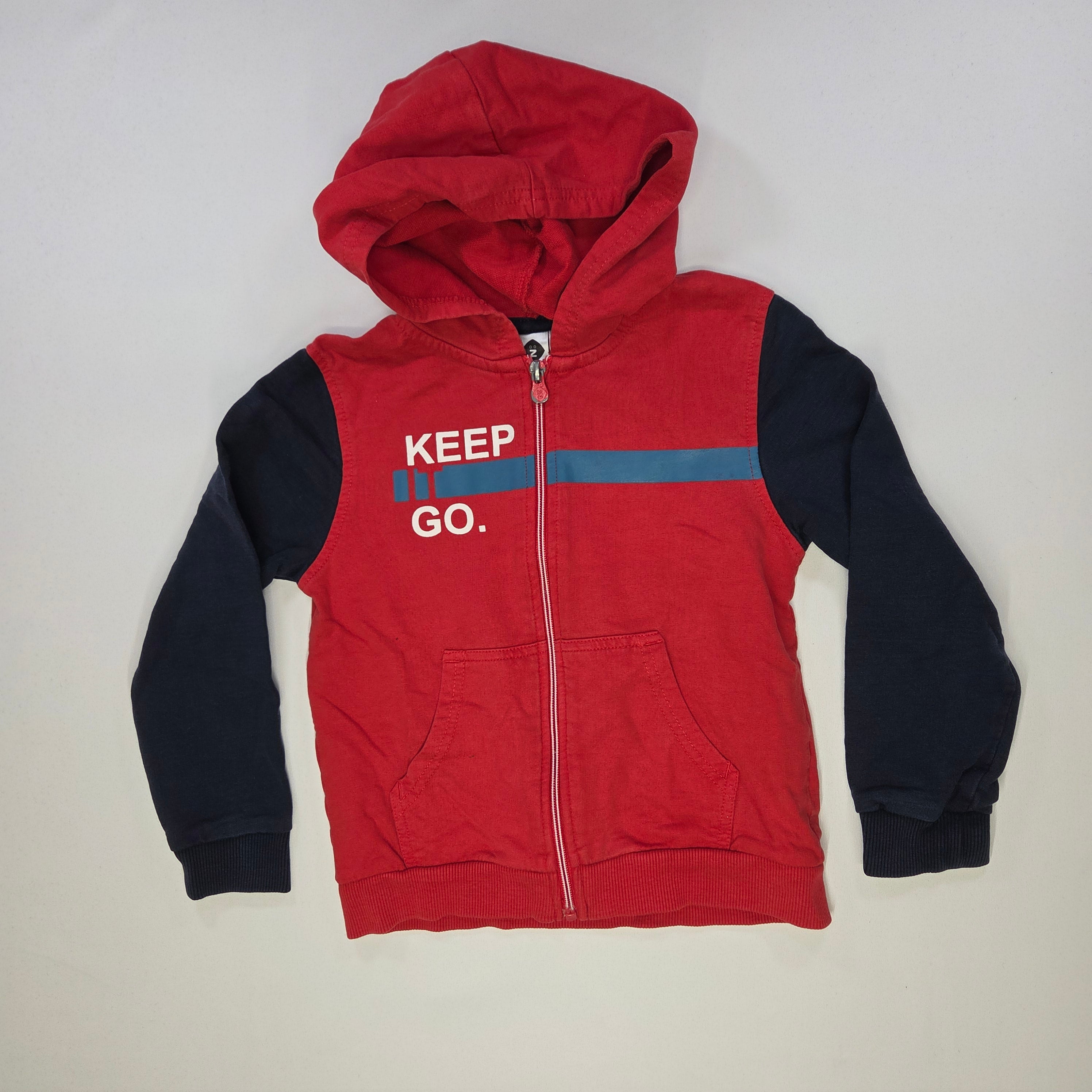 Questo allegro hoodie rosso è l'aggiunta perfetta per il guardaroba dei più piccoli! Realizzato in morbido cotone, offre calore e comfort per le avventure all'aperto. La scritta "KEEP GO." grigia su fondo rosso aggiunge un tocco motivazionale e alla moda. Le maniche blu a contrasto donano un look vivace e moderno, perfetto per ogni occasione. Con una comoda zip e pratiche tasche, questo capo usato è in buone condizioni e pronto per essere indossato da un piccolo esploratore! Un must-have per le giornate fresche!