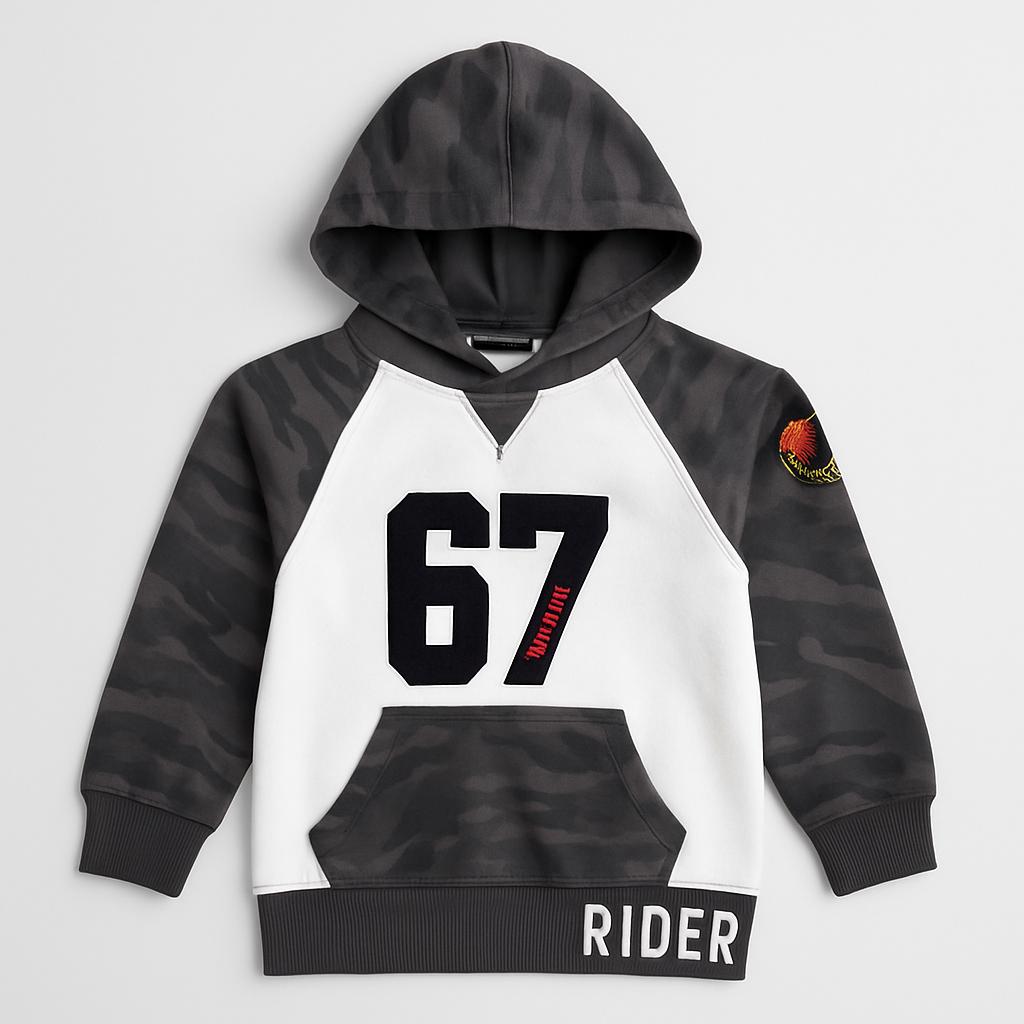 Questo trendy felpa con cappuccio è perfetta per i piccoli avventurieri! Con il suo design camouflage grigio e bianco, il numero “67” in evidenza sul davanti e il logo “RIDER” sul fondo, trasmette un'aria sportiva e alla moda. Realizzata in un morbido tessuto, offre calore e comfort per le giornate fresche, rendendola ideale per giocare all'aperto o per un look casual. Anche se è un capo usato, si presenta in ottime condizioni, pronto a diventare il preferito del guardaroba del tuo bambino!