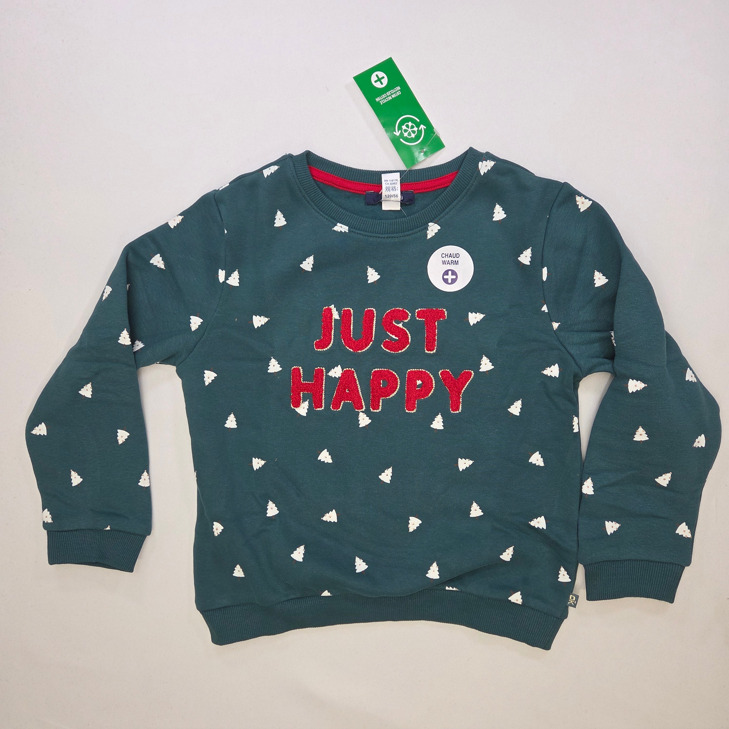 Questo sprizzante pullover, con una deliziosa tonalità verde, è perfetto per le giornate autunnali e invernali! Realizzato in morbido materiale, regala comfort e calore ai vostri piccoli. Il design è caratterizzato dalla scritta "JUST HAPPY" in un allegro rosso, che diffonde una ventata di positività e gioia. Decorato con piccole forme di alberelli bianchi, aggiunge un tocco festoso e giocoso. Le maniche lunghe garantiscono comodità e libertà di movimento per avventure in ogni stagione. Nonostante sia un capo usato, si presenta in ottime condizioni, pronto a portare un sorriso nel guardaroba dei bambini!