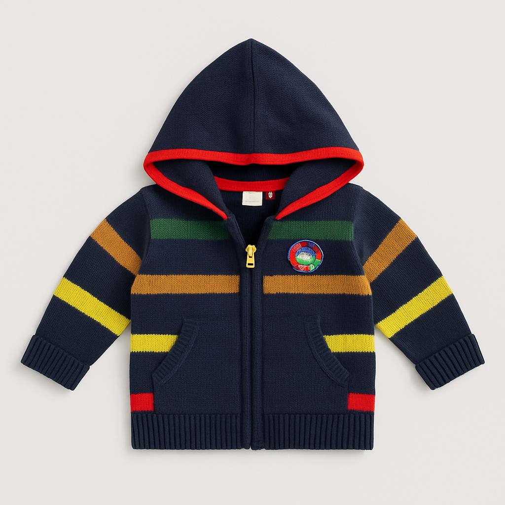 Questo fantastico cardigan per bambini è un vero capolavoro di stile e comfort! Realizzato in morbido cotone, presenta un vivace gioco di colori blu, giallo, rosso e verde, che renderà ogni outfit unico e allegro. La chiusura con zip e il cappuccio lo rendono perfetto per le fresche giornate autunnali, mentre il patch decorativo sul petto aggiunge un tocco di originalità. Nonostante sia un capo usato, è in ottime condizioni, pronto per accompagnare il tuo piccolo in tutte le sue avventure! Un'ottima scelta per i piccoli fashionisti!