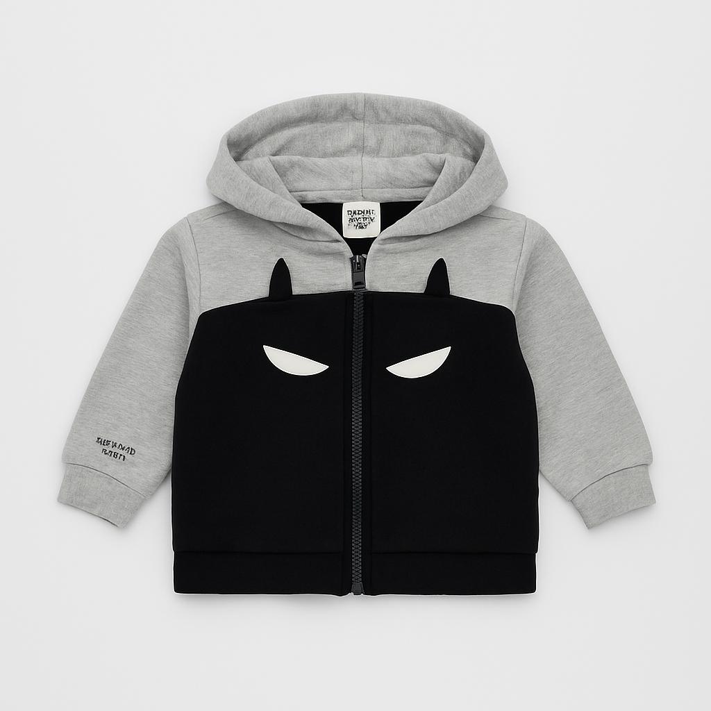 Questo fantastico giubbotto con cappuccio porterà un tocco di supereroismo nel guardaroba del tuo piccolo! Realizzato in un morbido misto cotone, presenta un vivace contrasto tra il grigio e il nero. I dettagli delle orecchie e gli occhi stilizzati sul fronte lo rendono perfetto per i piccoli fan di Batman. La chiusura con zip e il taglio comodo garantiscono calore e libertà di movimento, ideali per le avventure all'aperto. Nonostante sia usato, è in buone condizioni e pronto per essere indossato in ogni occasione, sia per giocare che per unirsi a una giornata di supereroi!