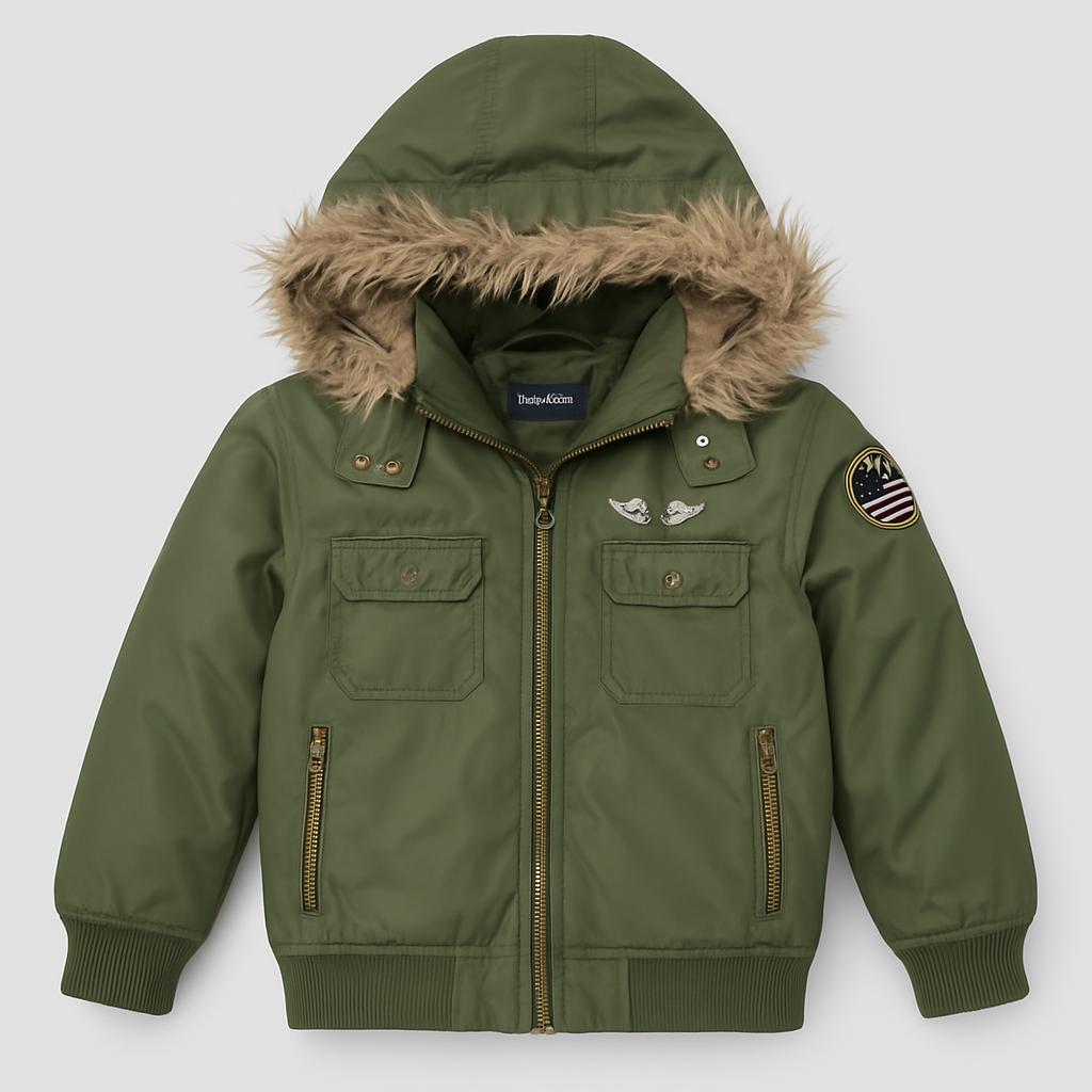 Questa giacca in stile militare è perfetta per i piccoli esploratori! Realizzata in un caldo tessuto verde oliva, è dotata di un'accogliente fodera in pelliccia sintetica che offre comfort e stile. Il cappuccio, anch'esso bordato di pelliccia, protegge dal freddo durante le avventure all'aperto. Le tasche anteriori sono pratiche e aggiungono un tocco trendy, mentre i dettagli con patch e zip dorata rendono il capo unico e alla moda. Nonostante sia usata, si presenta in ottime condizioni, pronta per essere indossata durante le giornate più fresche. Un must-have per tutti i piccoli che amano la moda e la comodità!