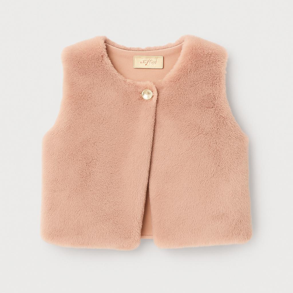 Questo adorabile gilet in pelliccia sintetica crea un'atmosfera di dolcezza e coccole per ogni piccola. Di un delicato color rosa cipria, il gilet è morbido al tatto e perfetto per aggiungere un tocco di stile e calore ai look invernali. La chiusura con bottone rende l'indossarlo semplice e pratico, mentre il design senza maniche offre libertà di movimento. Perfetto per essere abbinato a una maglietta e dei pantaloni o per completare un outfit da festa. Nonostante sia un capo usato, è in ottime condizioni e pronto a regalare comfort e charme!