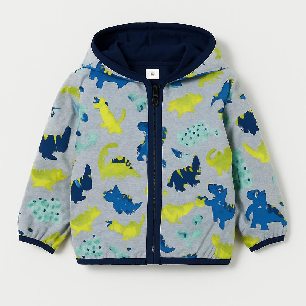 Scopri questa fantastica giacca per bambini, ideale per i piccoli amanti dei dinosauri! Realizzata in un morbido e leggero materiale, presenta un vivace design con dinosauri colorati su sfondo grigio. La chiusura con zip e il cappuccio la rendono perfetta per affrontare le giornate di pioggia o per giocare all'aperto. Le maniche elastiche aggiungono comfort e praticità, mentre il tocco di blu sulla fodera interna la rende ancora più accattivante. Nonostante sia un capo usato, è in buone condizioni e pronto per nuove avventure! Un must-have per i giovani esploratori!