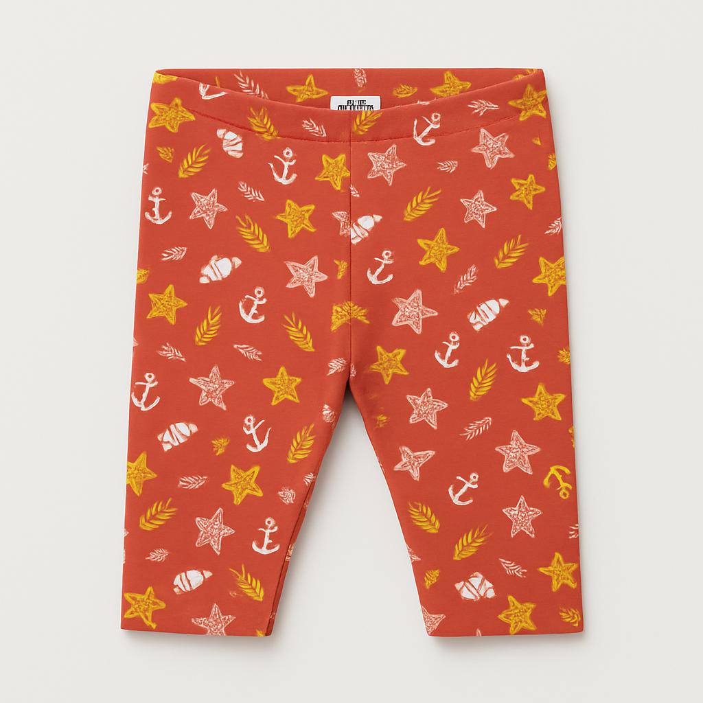 Questi adorabili leggings per bambini sono perfetti per le piccole esploratrici che amano il mare! Con un vivace colore arancione e un divertente motivo marino, tra stelle marine, ancore e nuvolette, portano un tocco di allegria in ogni outfit. Realizzati in un morbido tessuto elastico, garantiscono comodità e libertà di movimento durante il gioco e le avventure estive. Anche se sono capi usati, si presentano in ottime condizioni e sono pronti per accompagnare tante altre giornate piene di sorrisi e risate! Un must per ogni guardaroba!