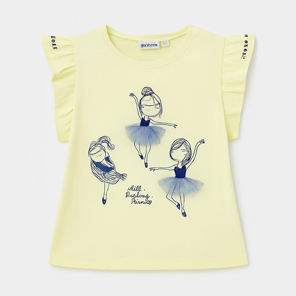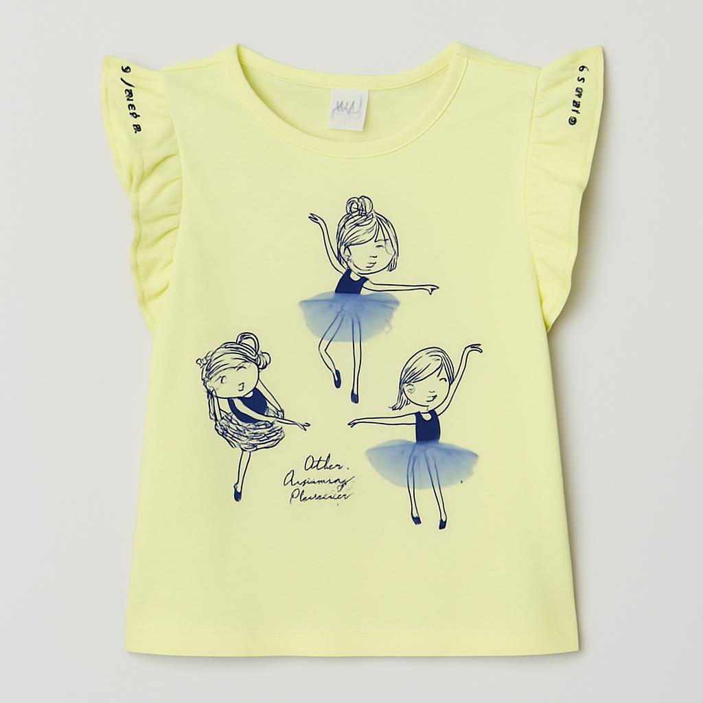 Questa adorabile t-shirt gialla è perfetta per le piccole principesse che amano danzare! Realizzata in cotone morbido, presenta graziosi volant sulle spalle che aggiungono un tocco frizzante e femminile. La stampa vivace sul fronte raffigura deliziose ballerine in movimento, rendendola ideale per ogni avventura creativa. Nonostante sia un capo usato, è in ottime condizioni, pronta a far brillare il guardaroba della tua bambina. Perfetta per occasioni casual o una giornata di gioco, questa t-shirt unisce comfort e stile in modo unico!