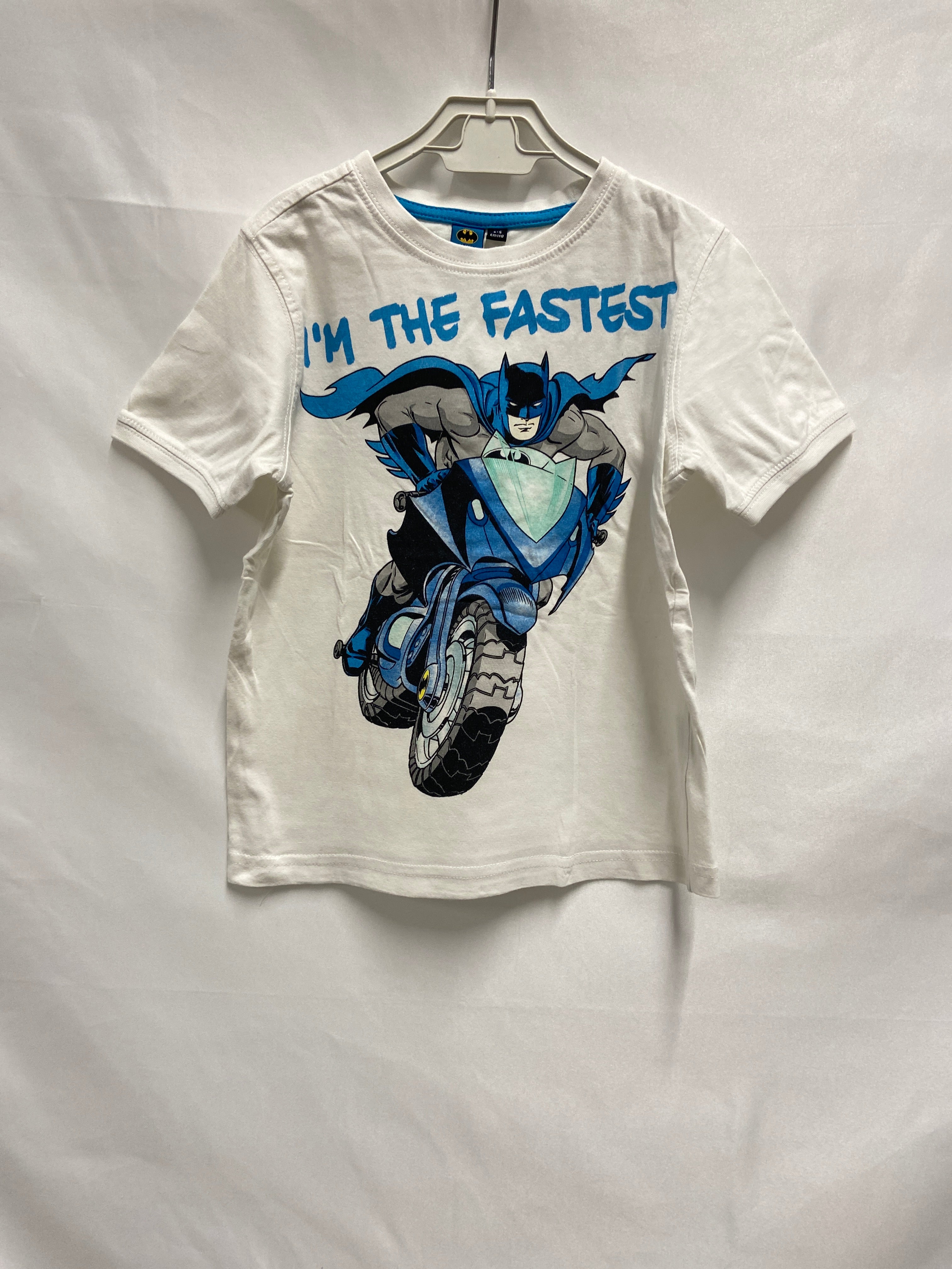 Questa fantastica t-shirt bianca con il mitico Batman porterà il tuo bambino in un'avventura supereroica! Realizzata in morbido cotone, la maglietta presenta un vivace design con Batman in azione su una moto, accompagnato dalla scritta "I'M THE FASTEST". Le maniche corte e il taglio leggero alzano il livello di comfort, perfetta per giornate di gioco e avventure all’aria aperta. Nonostante sia un capo usato, si presenta in ottime condizioni, pronta per nuove epiche missioni! Un vero must-have per i piccoli fan dei supereroi!