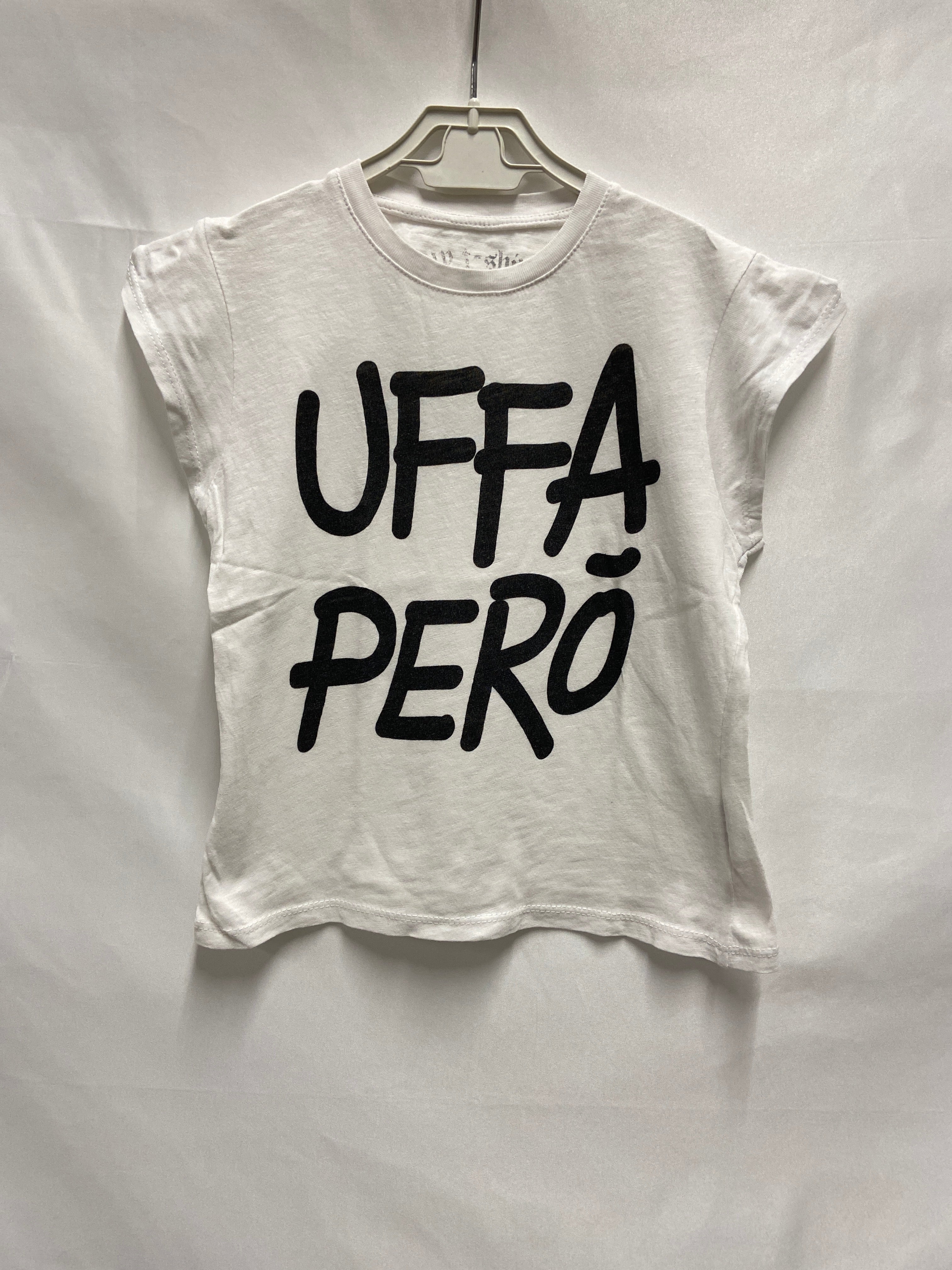 Questa vivace t-shirt bianca con stampa nera è perfetta per le piccole pioniere delle emozioni! La scritta "UFFA PERÒ" aggiunge un tocco giocoso e ribelle, ideale per esprimere la personalità dei bambini. Realizzata in morbido cotone, offre comfort e freschezza durante le calde giornate estive. Le maniche corte e il taglio ampio rendono questo capo versatile, perfetto per un look casual con jeans, shorts o una gonna leggera. Anche se usata, è in ottime condizioni e pronta per accompagnare tante avventure! Un vero must-have per ogni piccola trendsetter!
