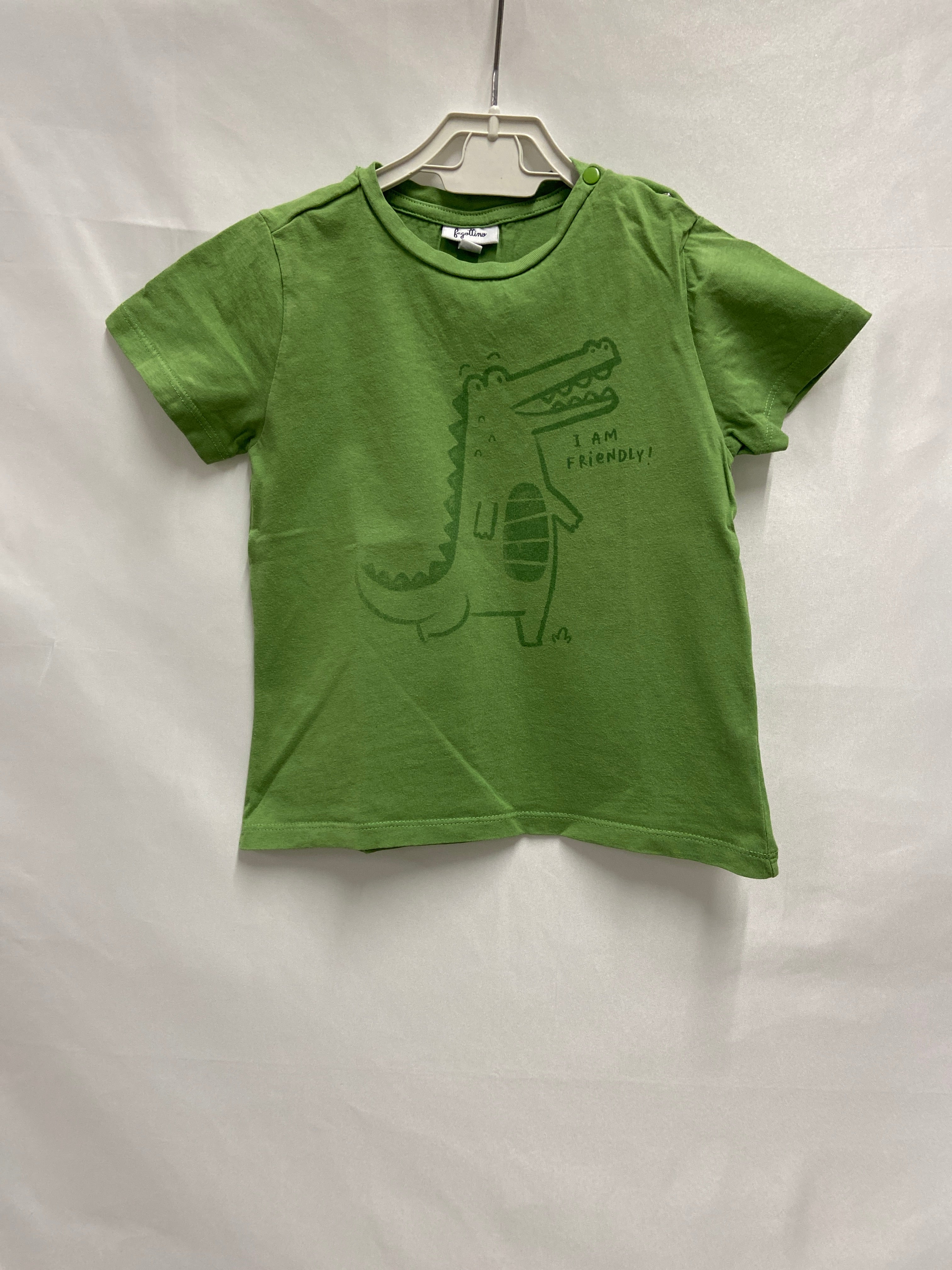 Questa adorabile t-shirt verde, perfetta per i piccoli amanti degli animali, trasmette un messaggio di amicizia con la sua simpatica grafica di un coccodrillo sorridente. Realizzata in cotone morbido e traspirante, è ideale per le giornate calde. Le maniche corte e il taglio casual garantiscono comfort durante le avventure quotidiane. Nonostante sia un capo usato, si presenta in ottime condizioni, pronta per essere indossata da un piccolo esploratore. Un'aggiunta vivace e giocosa al guardaroba dei più giovani!