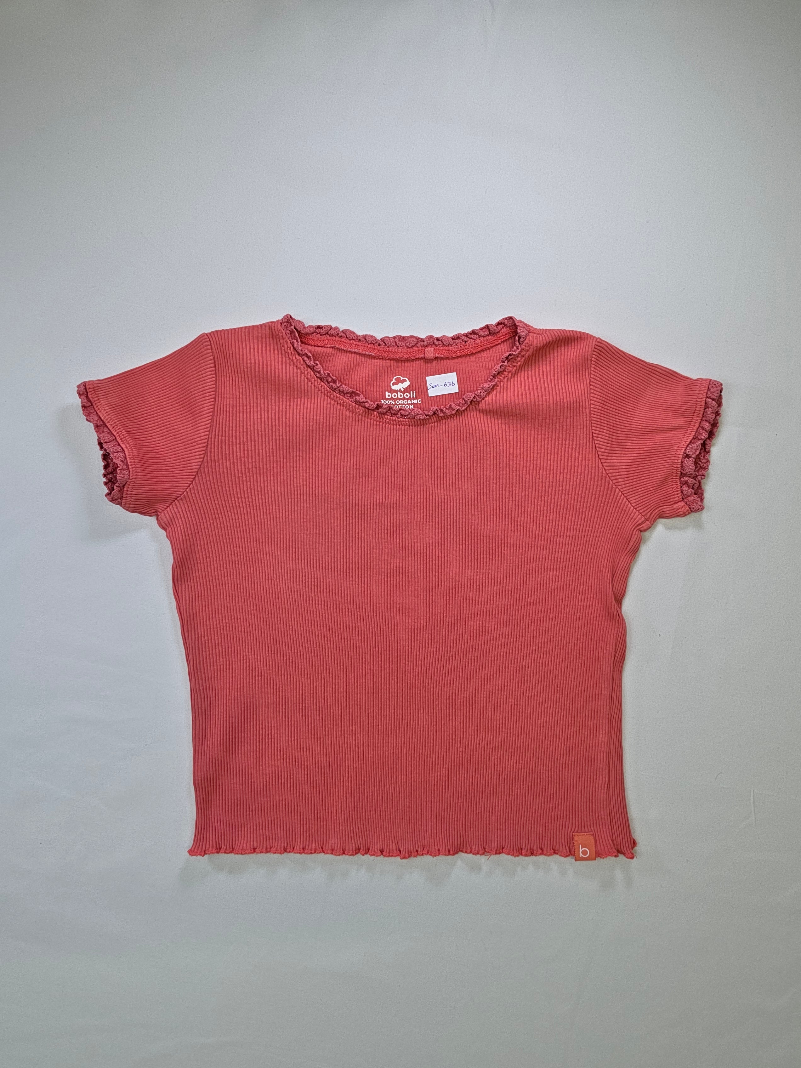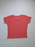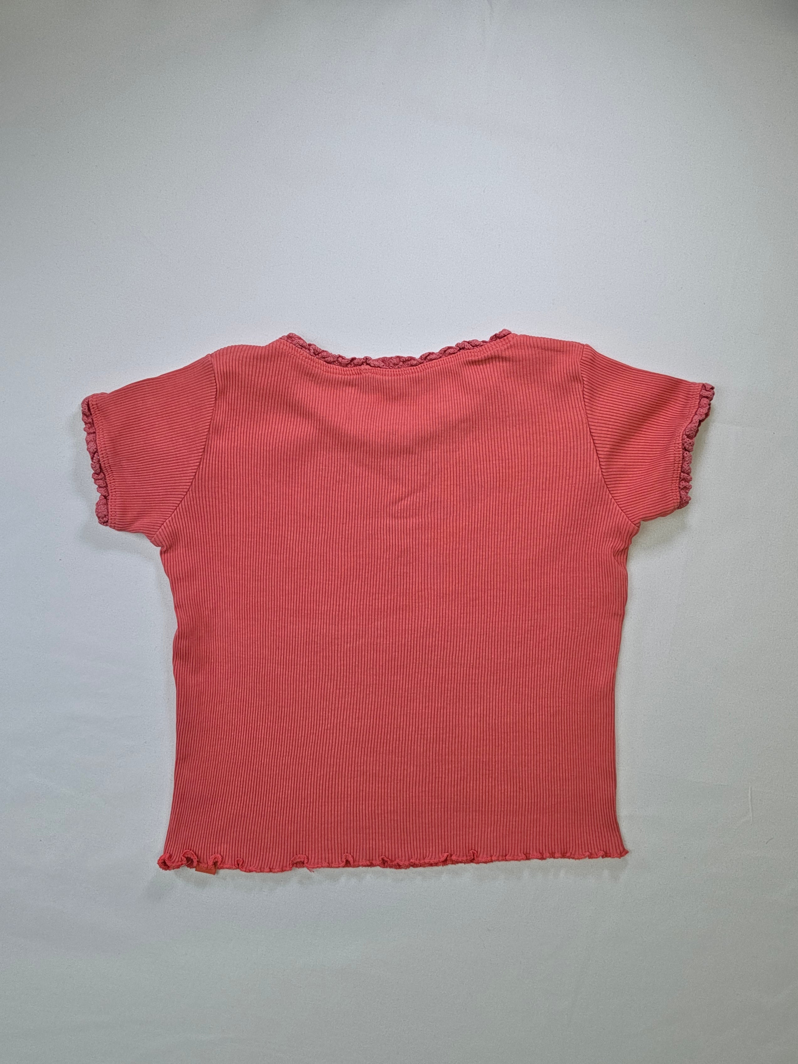 Questa adorabile t-shirt rosa, con delicate finiture arricciate, è il pezzo perfetto per il guardaroba della tua piccola! Realizzata in morbido tessuto a coste, offre comfort e stile in ogni occasione. Il taglio fresco e le maniche corte la rendono ideale per le calde giornate estive. Le sue rifiniture dal gusto giocoso donano un tocco di originalità, perfetta per ogni avventura quotidiana. Anche se usata, è in ottime condizioni e pronta a ricevere tantissime nuove storie! Un must-have per le piccole trendsetter!