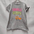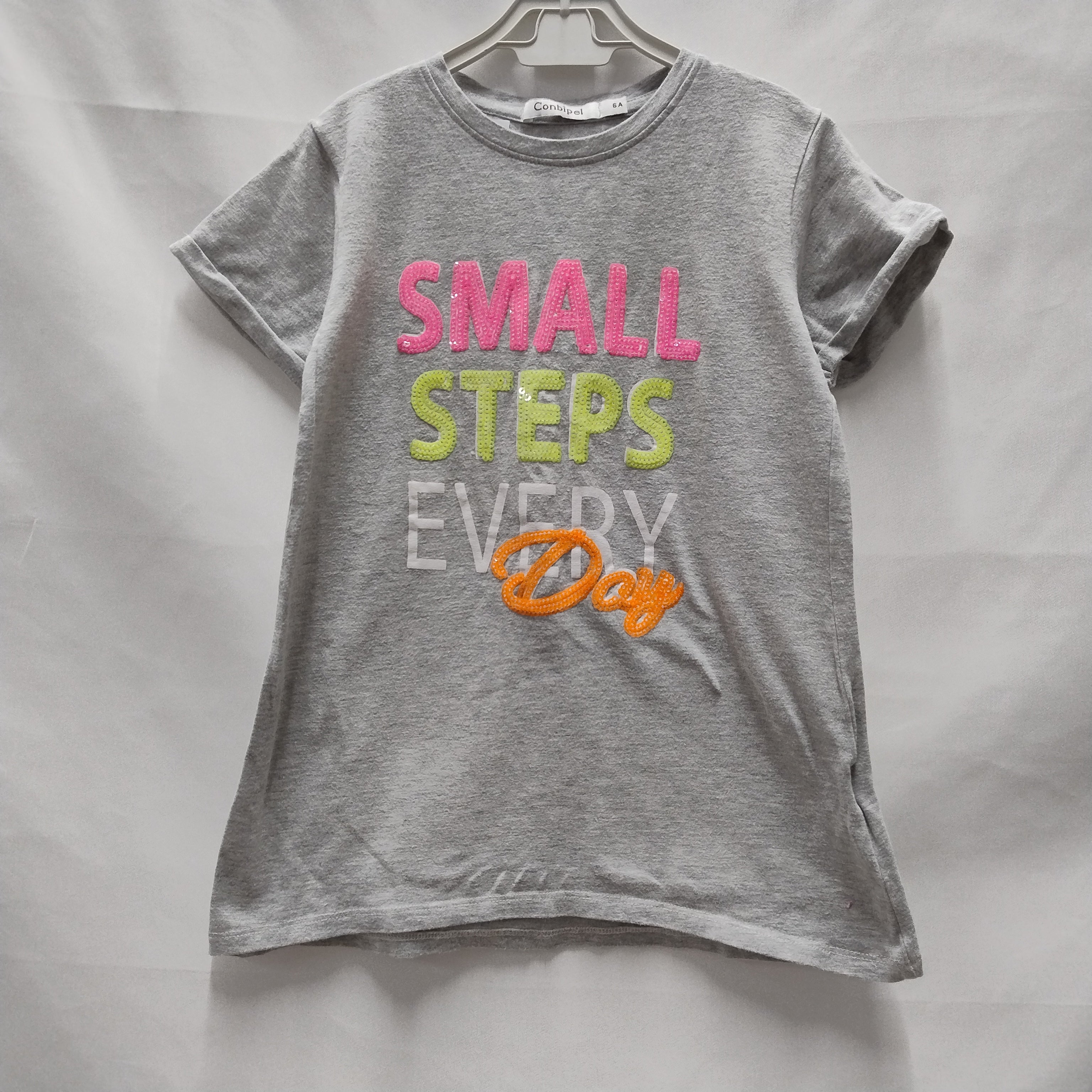 Questa adorabile maglietta grigia è perfetta per le piccole sognatrici! Con una scritta vivace “SMALL STEPS EVERY DAY” in colori brillanti come fucsia, verde e arancione, porta un messaggio positivo e di motivazione. Realizzata in morbido cotone, offre comfort ideale per ogni avventura quotidiana. Le maniche corte e il design semplice la rendono versatile, perfetta da abbinare a jeans o gonne. Nonostante sia un capo usato, si presenta in ottime condizioni, pronta a diventare il nuovo favorito nel guardaroba della tua piccola!