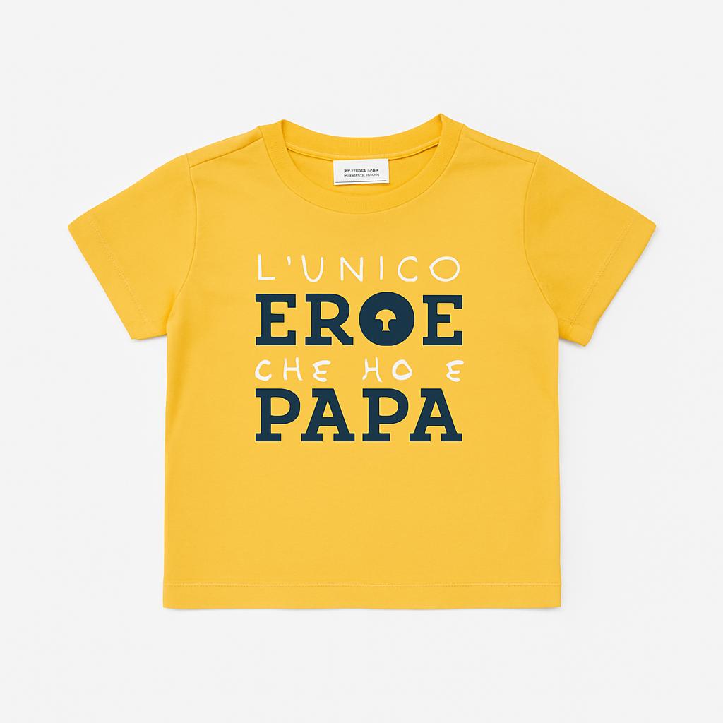 Questa splendida t-shirt gialla è perfetta per i piccoli fan dei supereroi! Con la scritta "L'unico Eroe che ho è Papa" in un vivace blu navy, questa maglietta trasmette un messaggio affettuoso e divertente. Realizzata in morbido cotone, offre comfort e freschezza durante le giornate di sole. Le maniche corte e il design pratico la rendono ideale per qualsiasi avventura quotidiana. Nonostante sia un capo usato, è in ottime condizioni, pronto per accompagnare il tuo bimbo in ogni gioco e risata! Un'ottima scelta per un look casual e affettuoso!