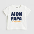 Questa adorabile t-shirt bianca di marca KIABI è un delizioso omaggio ai papà! Con una stampa divertente "MON PAPA c'est le plus fort!" in audaci lettere nere e gialle, è perfetta per far sorridere tutti. Realizzata in morbido cotone per garantire il massimo comfort, questa maglietta a maniche corte è ideale per le giornate di gioco e avventura. Nonostante sia un capo usato, è in ottime condizioni e pronta per essere indossata da piccoli sognatori. Perfetta per i piccolini che vogliono mostrare il loro amore per papà con stile!