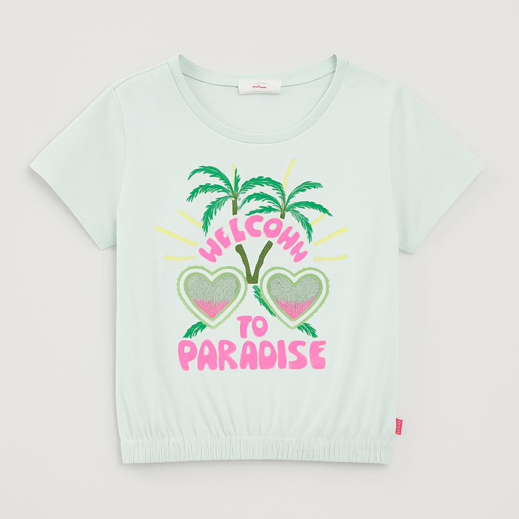 Questa adorabile t-shirt azzurra è perfetta per le piccole sognatrici! Con un design fresco e colorato, presenta scritte vivaci "WELCOME TO PARADISE" decorate con paesaggi tropicali e cuori brillanti. Il girocollo e il taglio leggermente arricciato in vita offrono un fit comodo, ideale per le calde giornate estive e le avventure all'aperto. Nonostante sia un capo usato, mantiene tutto il suo fascino, assicurando che ogni piccola possa viaggiare verso il suo paradiso personale con stile!
