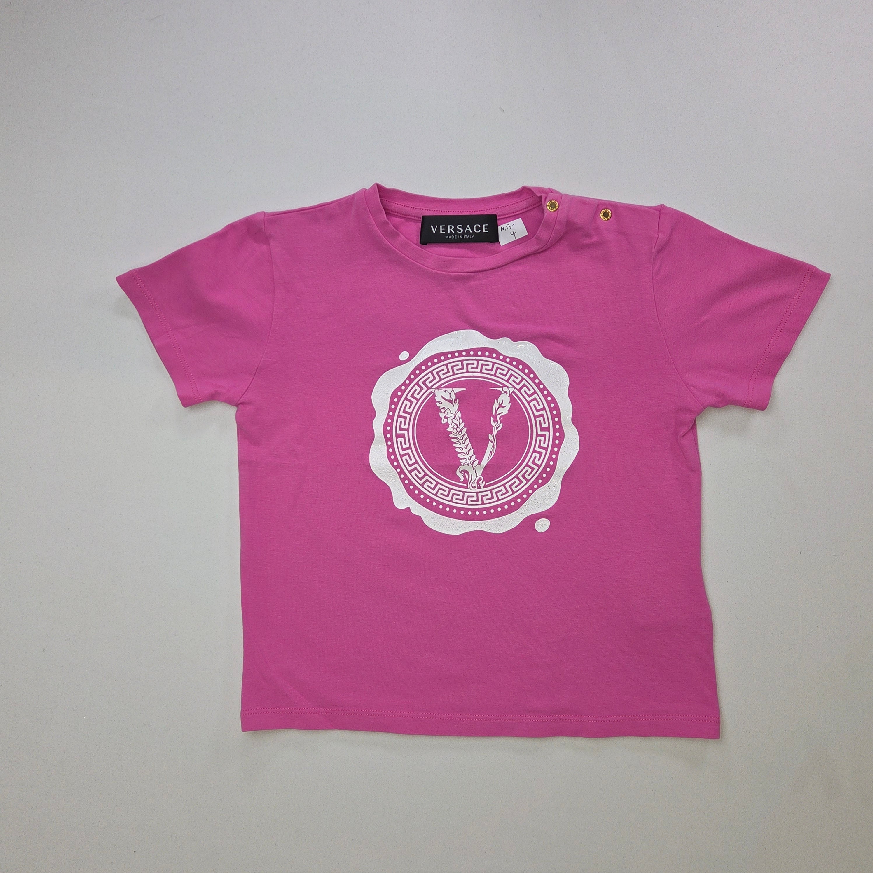 Fai brillare il guardaroba del tuo piccolo con questa splendida t-shirt di Versace! In un vivace color rosa, la maglietta presenta una grande stampa centrale che esprime l’eleganza del marchio. I dettagli dorati rendono il design ancora più accattivante, donando un tocco di lusso. Con il suo tessuto morbido e traspirante, questa maglietta è perfetta per l'estate e le avventure quotidiane. Nonostante sia un capo usato, è in ottime condizioni e pronto a far sentire speciale chi la indossa. Un vero pezzo da collezione per i piccoli trendsetter!