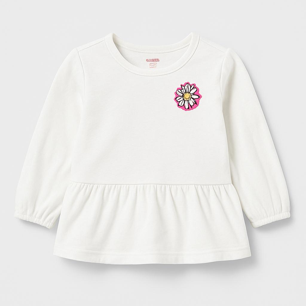 Questa deliziosa maglietta bianca con maniche lunghe è perfetta per ogni piccola amante della moda! Decorata con un'incantevole applicazione a forma di fiore colorato, aggiunge un tocco di allegria al look. Il taglio svasato e la leggera balza rendono questo capo comodo e grazioso, ideale per giochi e avventure quotidiane. Realizzata in morbido cotone, è facile da abbinare e rappresenta un'ottima scelta per le giornate fresche. Nonostante sia un capo usato, è in ottime condizioni e pronta per essere indossata con stile!