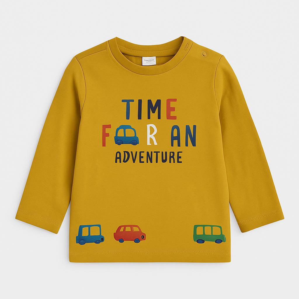 Questa vivace maglietta a maniche lunghe, di un allegro giallo senape, è perfetta per i piccoli avventurieri! Adornata con la scritta "TIME FOR AN ADVENTURE" in colori brillanti, cattura subito l'attenzione. Sotto il testo, troviamo simpatiche auto stilizzate che stimolano la fantasia dei bambini. Realizzata in cotone morbido, è perfetta per ogni occasione, dai giochi all'aperto alle giornate in famiglia. Nonostante sia un capo usato, si presenta in ottime condizioni, pronta a vivere nuove avventure! Un vero must-have per ogni guardaroba infantile!