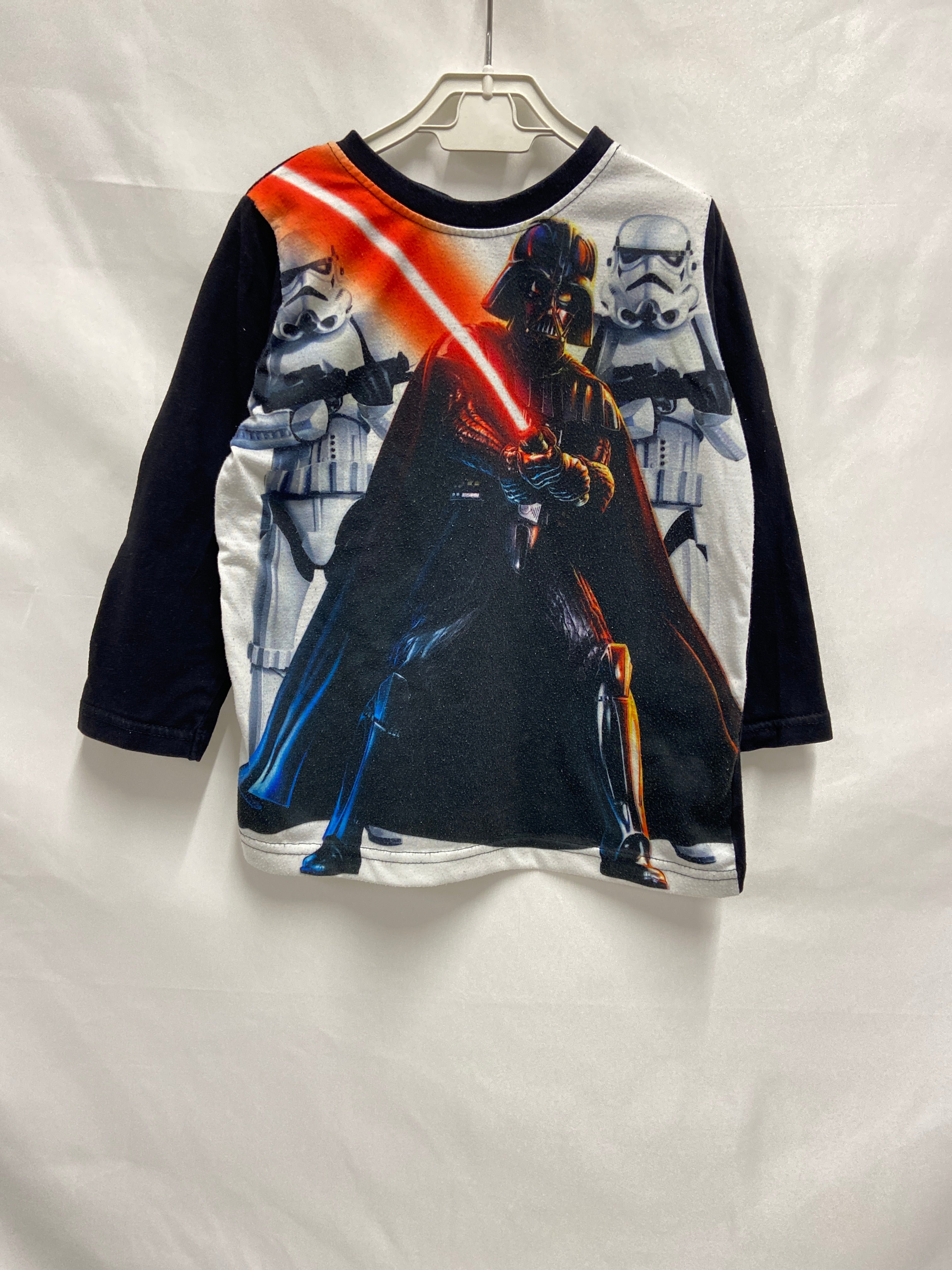 Fai sognare il tuo piccolo con questa maglietta a maniche lunghe ispirata all'universo di Star Wars! Realizzata in morbido cotone, presenta un fantastico design che ritrae il leggendario Darth Vader, affiancato dai temibili Stormtrooper. Il mix di colori accattivanti rende questo capo ideale per ogni giovane fan della saga galattica! Perfetta per le avventure quotidiane, offre comfort e stile in ogni occasione. Anche se usata, si presenta in ottime condizioni, pronta per accompagnare il tuo piccolo in ogni battaglia interstellare!