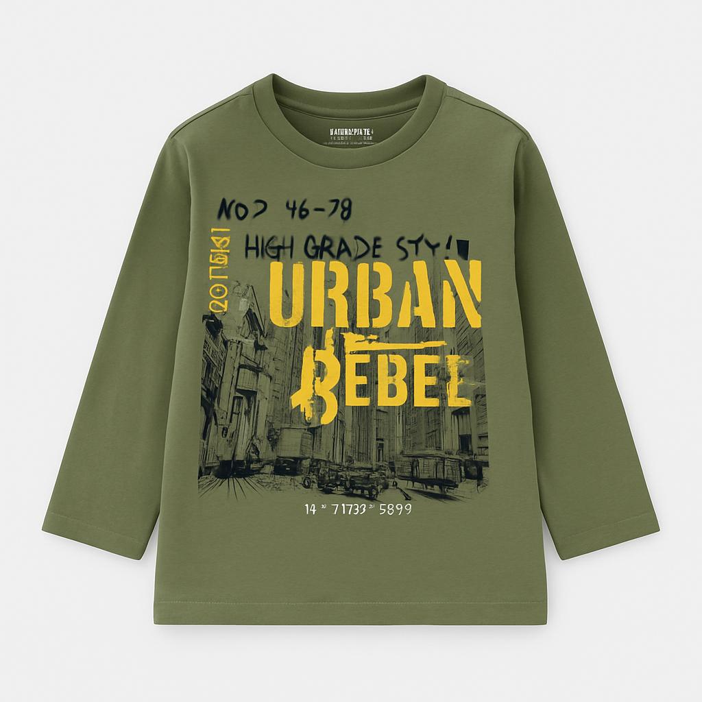 Aggiungi un tocco di avventura al guardaroba del tuo piccolo con questa originale t-shirt a maniche lunghe! Realizzata in morbido cotone, presenta un vivace verde oliva, perfetto per ogni stagione. La grafica urban e il messaggio "URBAN REBEL" in giallo brillante la rendono un capo trendy e ricco di personalità. Ideale per i giochi all'aperto o per un look casual e comodo. Anche se è un capo usato, si presenta in ottime condizioni, pronto per vivere nuove avventure! Un must-have per i piccoli ribelli della moda!