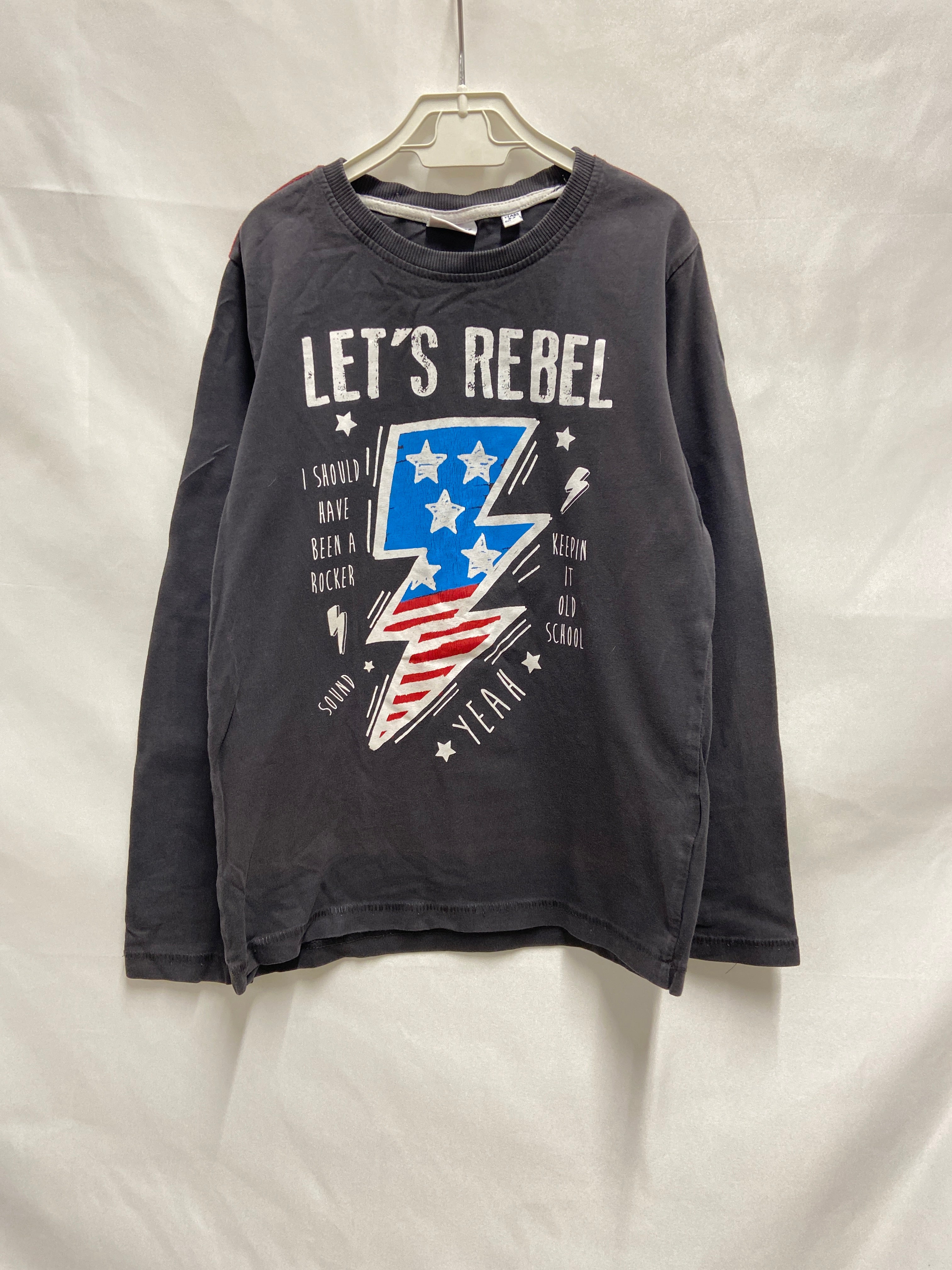 Questa maglietta a maniche lunghe, perfetta per i piccoli ribelli in erba, è un vero must-have per il guardaroba! Realizzata in morbido cotone, si presenta in un elegante shade di grigio scuro. Il grande motivo grafico sul davanti, con fulmine, stelle e la scritta "LET'S REBEL", conferisce un tocco audace e divertente. Ideale per le giornate fresche, questo capo è perfetto per essere indossato sia per un look casual che per avventure con gli amici. Nonostante sia usata, si trova in ottime condizioni ed è pronta per accompagnare le nuove avventure del tuo piccolo rocker!