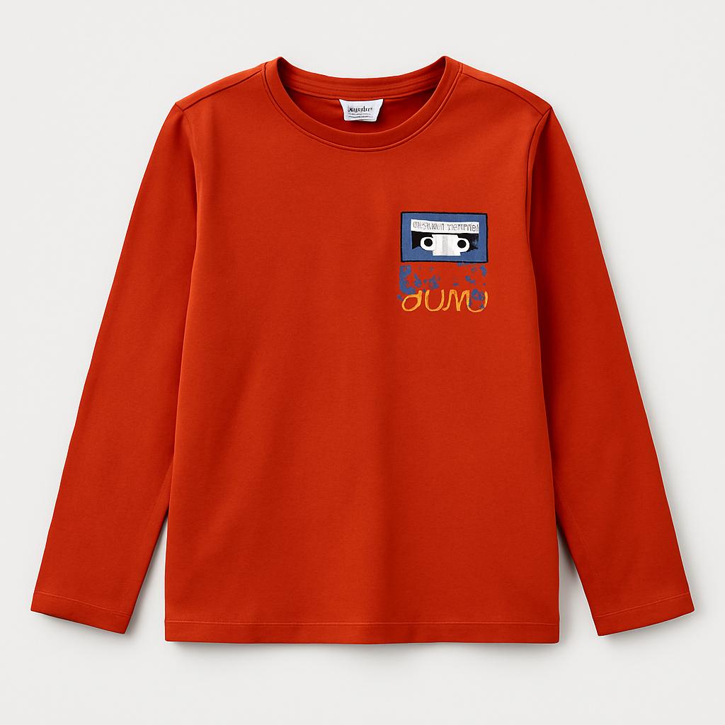 Questa simpatica maglietta a maniche lunghe in un vivace arancione è perfetta per i piccoli amanti della musica! Realizzata in morbido cotone, offre comfort durante tutta la giornata. Sul petto, un'adorabile stampa di una cassetta vintage con la scritta "somi" aggiunge un tocco retro e divertente, rendendo questo capo unico e alla moda. Ideale per le giornate fresche, è ottima da abbinare a pantaloni o jeans per un look casual di tendenza. Anche se è un pezzo usato, si presenta in ottime condizioni, pronta per essere indossata da un giovane esploratore!