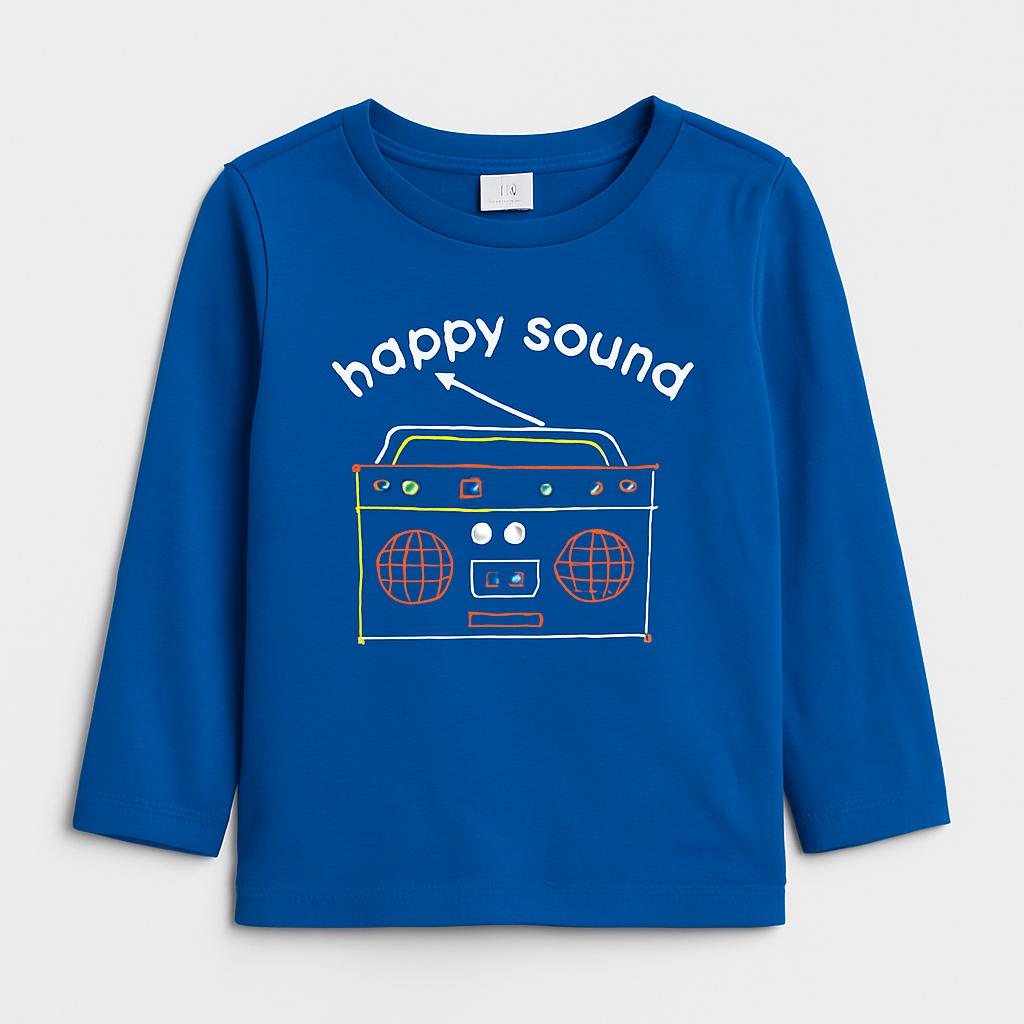 Fai brillare il guardaroba del tuo bambino con questa vivace maglietta blu di marca! Realizzata in morbido cotone, presenta un divertente motivo grafico di un vecchio stereo con la scritta "happy sound", perfetto per i piccoli amanti della musica. Le maniche lunghe assicurano comfort e calore, rendendola ideale per le giornate fresche o serate in famiglia. Nonostante sia un capo usato, si trova in ottime condizioni e porterà un sorriso nel cuore del tuo piccolo. Un'ottima scelta per giocare e divertirsi in grande stile!
