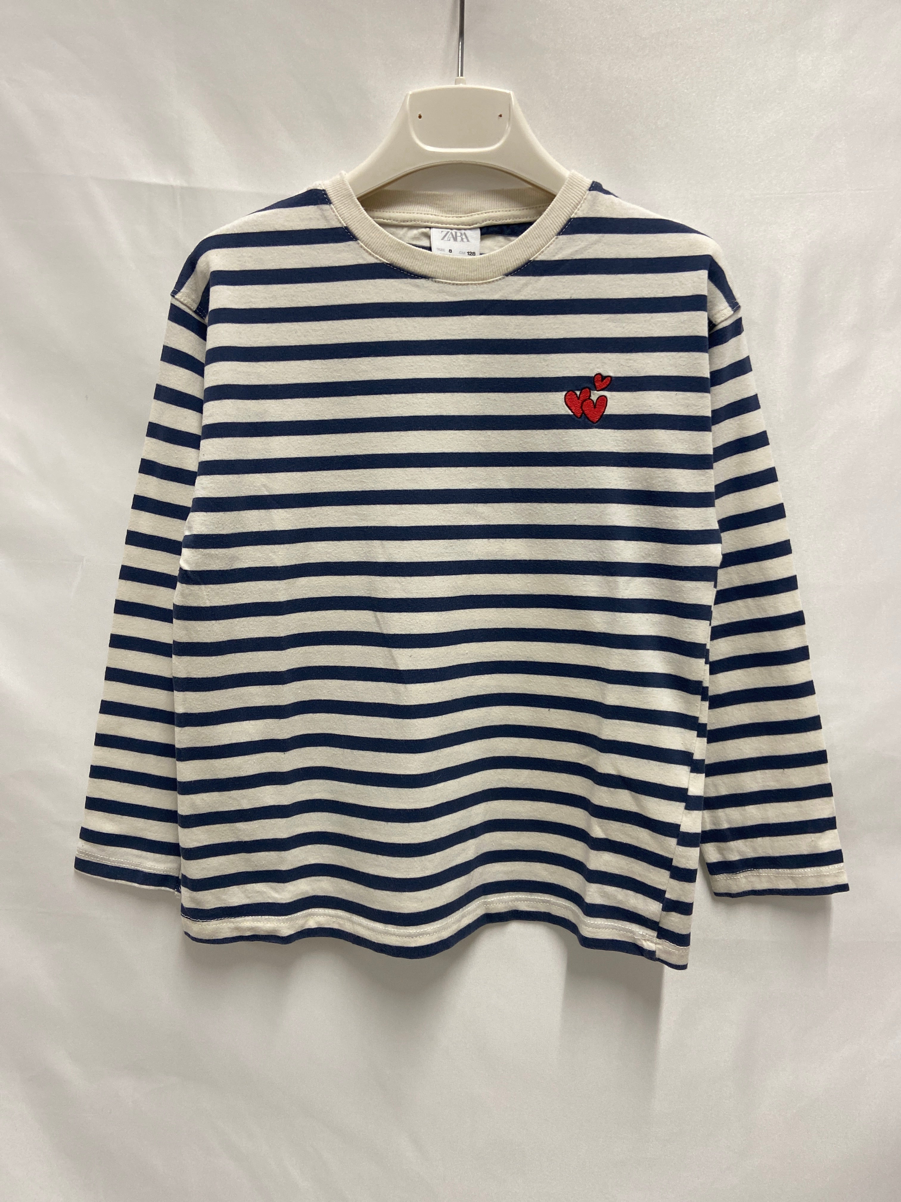 Questo adorabile maglione a righe è perfetto per i piccoli esploratori! Realizzato in un morbido tessuto, presenta eleganti righe bianche e blu che richiamano il classico stile marinaro. Aggiungendo un tocco di originalità, un cuore rosso ricamato sul petto esprime dolcezza e affetto. Le maniche lunghe e il taglio comodo lo rendono ideale per le giornate più fresche, sia per la scuola che per il tempo libero. Nonostante sia un capo usato, è in ottime condizioni e pronto a far felice un piccolo amante della moda! Un must-have per un look casual e trendy!