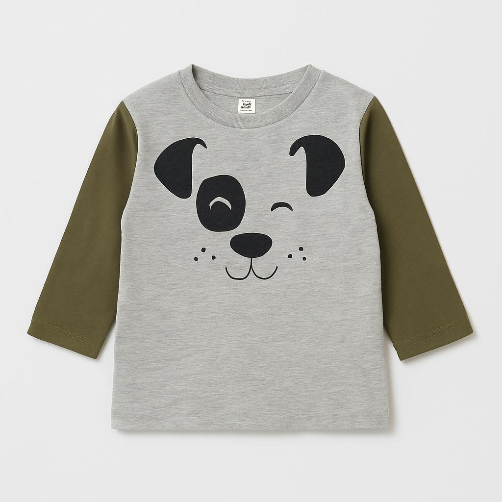 Questa adorabile maglietta a maniche lunghe è perfetta per i piccoli amanti degli animali! Realizzata in morbido cotone grigio, presenta un divertente motivo di un simpatico cagnolino che strizza l'occhio. Le maniche in verde militare aggiungono un tocco trendy e originale. Ideale per le giornate di gioco o per un look casual e alla moda, questa t-shirt è un capo usato ma in ottime condizioni, pronto a regalare sorrisi e comfort al tuo bambino. Un must-have per le mini avventuriere!