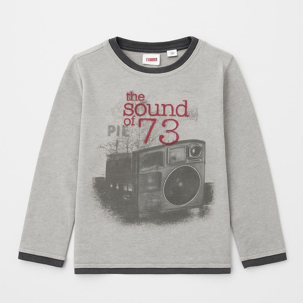 Questa maglietta a maniche lunghe in morbido cotone è perfetta per i piccoli amanti della musica! Il suo elegante grigio mélange è impreziosito da una stampa vintage che riproduce un vecchio stereo con la scritta "the sound of 73". Un look cool e ricercato che farà brillare il guardaroba dei tuoi bambini. La vestibilità comoda offre libertà di movimento per giocare e divertirsi. Perfetta per le fresche giornate autunnali o invernali, questa maglietta usata è in buone condizioni e pronta a diventare il nuovo preferito dei tuoi piccoli fashionisti!