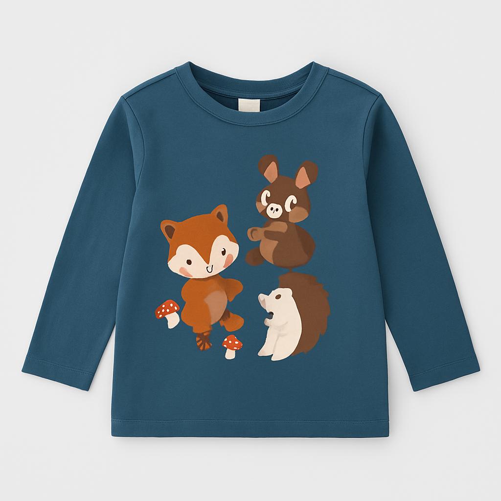 Questa adorabile maglietta a maniche lunghe è perfetta per i piccoli amanti della natura! Realizzata in morbido cotone, veste di una piacevole tonalità blu scuro e presenta un incantevole motivo con simpatici animali del bosco: un volpino, un coniglio e un riccio, tutti intenti a giocare tra funghi colorati. Il taglio comodo la rende ideale per ogni avventura, sia che si tratti di una giornata al parco, sia di momenti di relax a casa. Pur essendo un capo usato, si presenta in ottime condizioni e pronta per accompagnare le esplorazioni di ogni piccolo esploratore! Un must-have per chi ama il divertimento e la fantasia!
