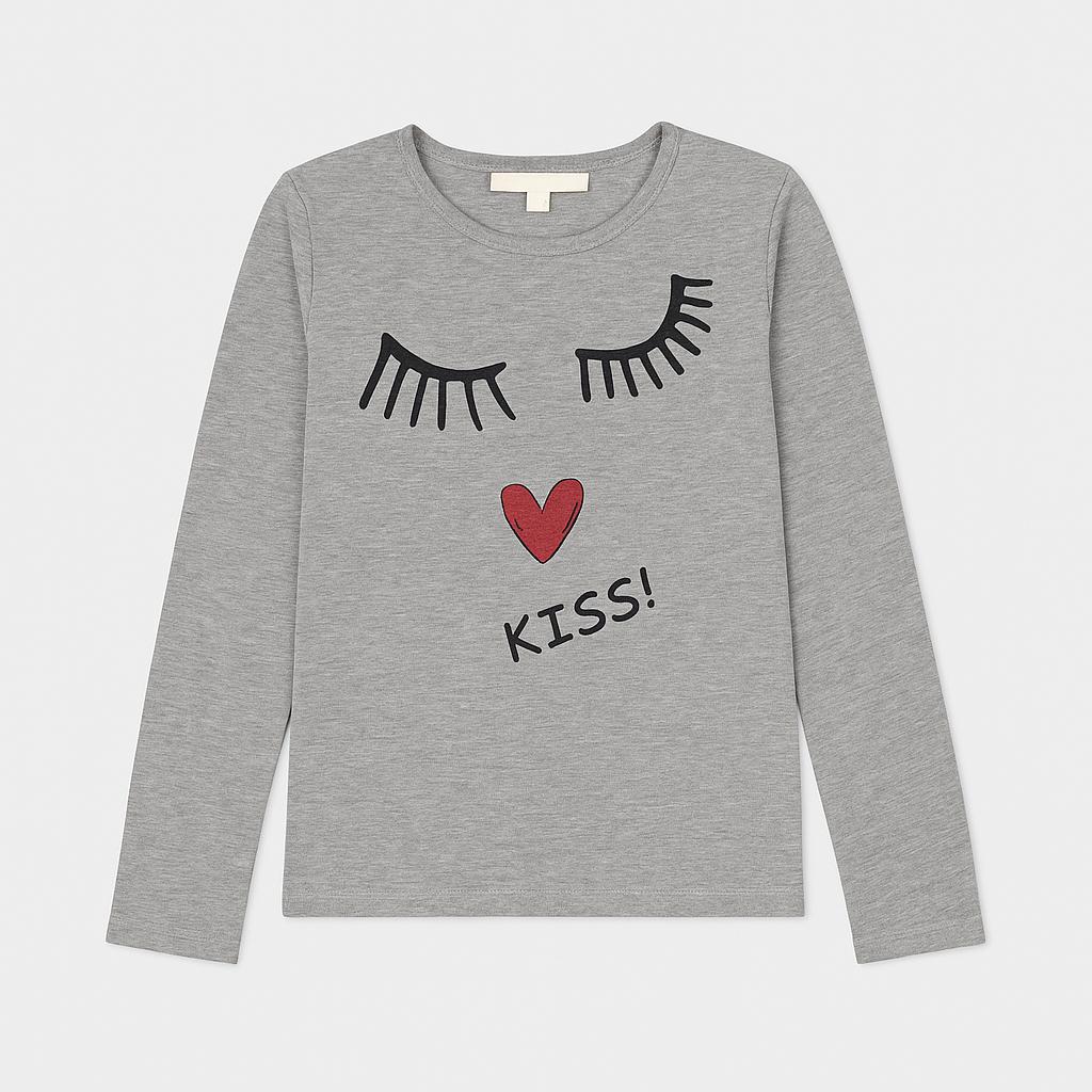 Questa adorabile maglietta a maniche lunghe è perfetta per le piccole romantiche! Realizzata in morbido cotone grigio, presenta un design giocoso con occhi stilizzati e un cuore rosso che dice "KISS!!". Comoda e trendy, questa maglietta è ideale per ogni occasione, dalle giornate a scuola ai momenti di gioco. Nonostante sia un capo usato, si presenta in ottime condizioni e porterà un sorriso nel guardaroba della tua bambina! Un must-have per chi ama esprimere il proprio stile in modo divertente!