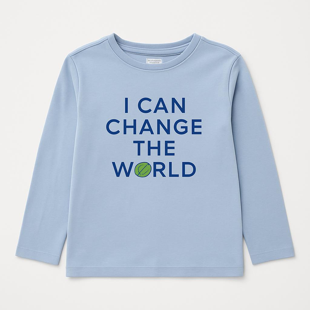 Questa adorabile maglietta a maniche lunghe è perfetta per i piccoli sognatori! Realizzata in un delicato blu chiaro, porta un messaggio ispiratore “I CAN CHANGE THE WORLD” stampato con lettere grandi e vivaci. Il design semplice ma di impatto la rende ideale per ogni occasione, dal gioco all'uscita con la famiglia. Il tessuto è morbido al tatto e comodo per una vestibilità che dura tutto il giorno. Nonostante sia un capo usato, si presenta in ottime condizioni, pronta per far brillare il guardaroba del tuo bambino! Un vero invito a sognare in grande!