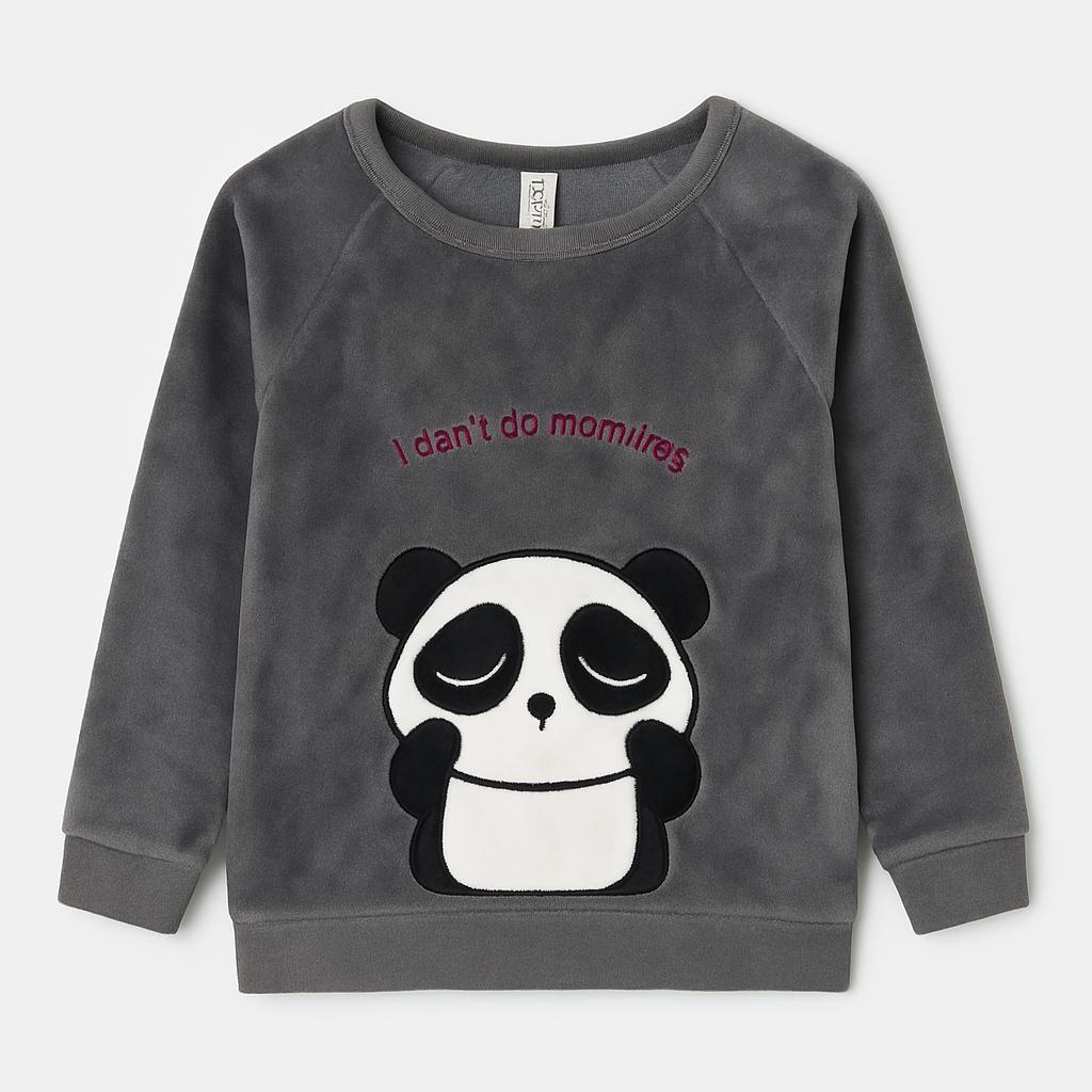 Questo adorabile pullover in morbido microfibra grigia è perfetto per le piccole pigrone che amano il comfort! Con un simpatico panda stampato sul davanti e la scritta "I don't do mornings", aggiunge un tocco di dolce ironia ai look mattutini. Le maniche lunghe e il design accogliente lo rendono ideale per le giornate fresche, per rimanere coccolati durante il gioco o il relax a casa. Anche se usato, si presenta in ottime condizioni e sarà certamente amato da chiunque cerchi un capo comodo e giocoso!