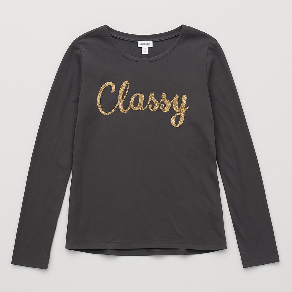 Questa adorabile maglietta a maniche lunghe di marca OVS è perfetta per le piccole pioniere della moda! Realizzata in un tessuto morbido e confortevole, si presenta in un elegante grigio scuro, impreziosito da una scritta "Classy" in scintillanti paillettes dorate. Ideale per outfit casual o per occasioni speciali, questa maglia è versatile e alla moda. Il taglio leggermente svasato e le maniche lunghe la rendono comoda per le giornate fresche. Nonostante sia un indumento usato, è in ottime condizioni e pronta a far brillare il guardaroba della tua bimba! Un vero must-have per le piccole fashioniste!