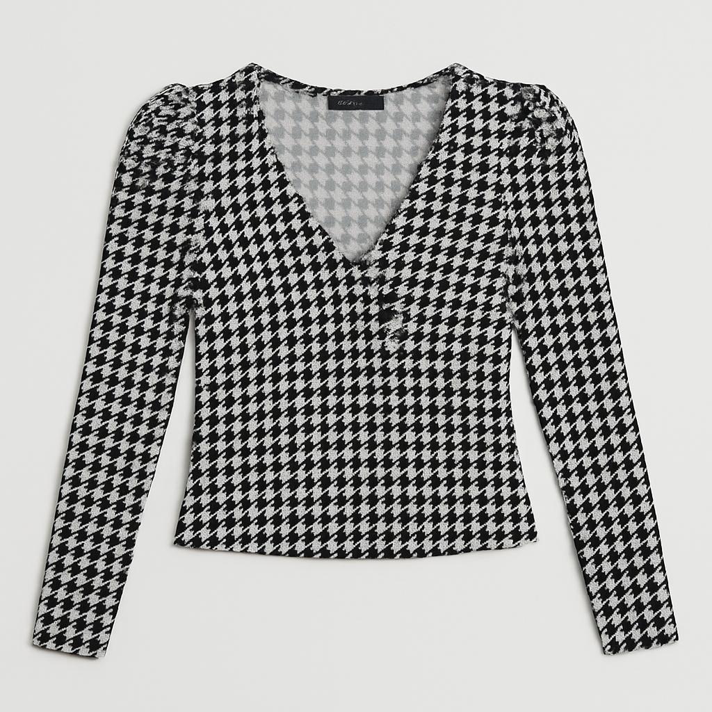 Questa elegante maglietta a maniche lunghe è perfetta per le piccole trendsetter! Con un delizioso motivo pied-de-poule in bianco e nero, aggiunge un tocco chic al guardaroba. La scollatura a V e le maniche con morbide arricciature donano un'aria sofisticata e alla moda, ideale per ogni occasione, dalle feste alle uscite nel weekend. Nonostante sia un capo usato, si presenta in ottime condizioni, pronta a far brillare il look della tua piccola! Un must per chi ama essere al passo con le tendenze!