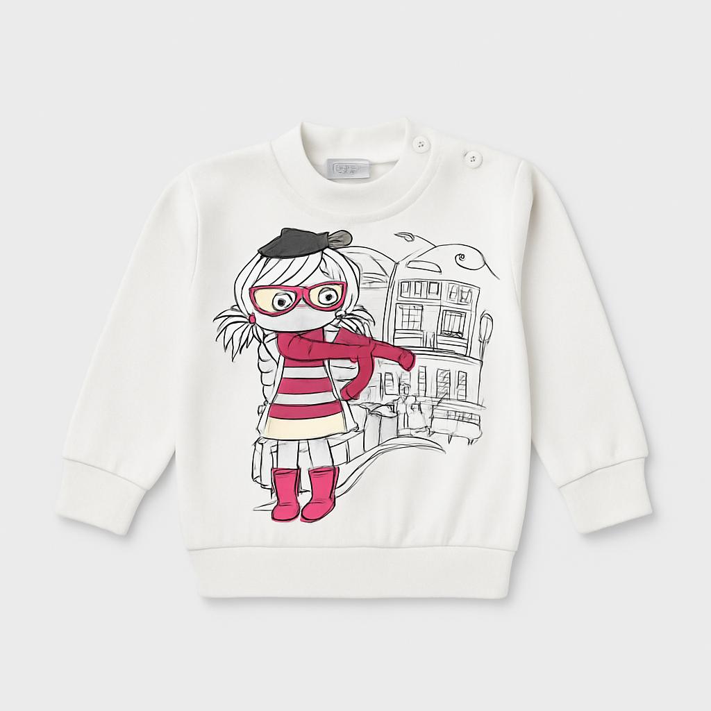 Questa adorabile felpa bianca per bambini è perfetta per le piccole aventuriere! Realizzata in morbido cotone, presenta un'illustrazione simpatica di una bambina con occhiali e un cappello, vestita con strisce colorate. Le maniche lunghe e il colletto con bottoni rendono questo capo pratico e stiloso, ideale per le giornate fresche. Nonostante sia usata, si trova in ottime condizioni e sarà un'aggiunta originale al guardaroba della tua piccola! Comoda e divertente, è perfetta per esplorare il mondo con stile!