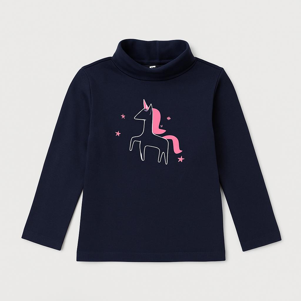 Questa maglietta a maniche lunghe è perfetta per le piccole sognatrici! Realizzata in morbido tessuto blu scuro, presenta un incantevole motivo di unicorno colorato sul davanti, circondato da stelle scintillanti. Il collo alto offre comfort e calore, rendendola ideale per le giornate più fresche. Nonostante sia un capo usato, si trova in ottime condizioni ed è pronto per accompagnare la tua bambina in molte avventure magiche. Un pezzo unico che aggiunge un tocco fiabesco al suo guardaroba!
