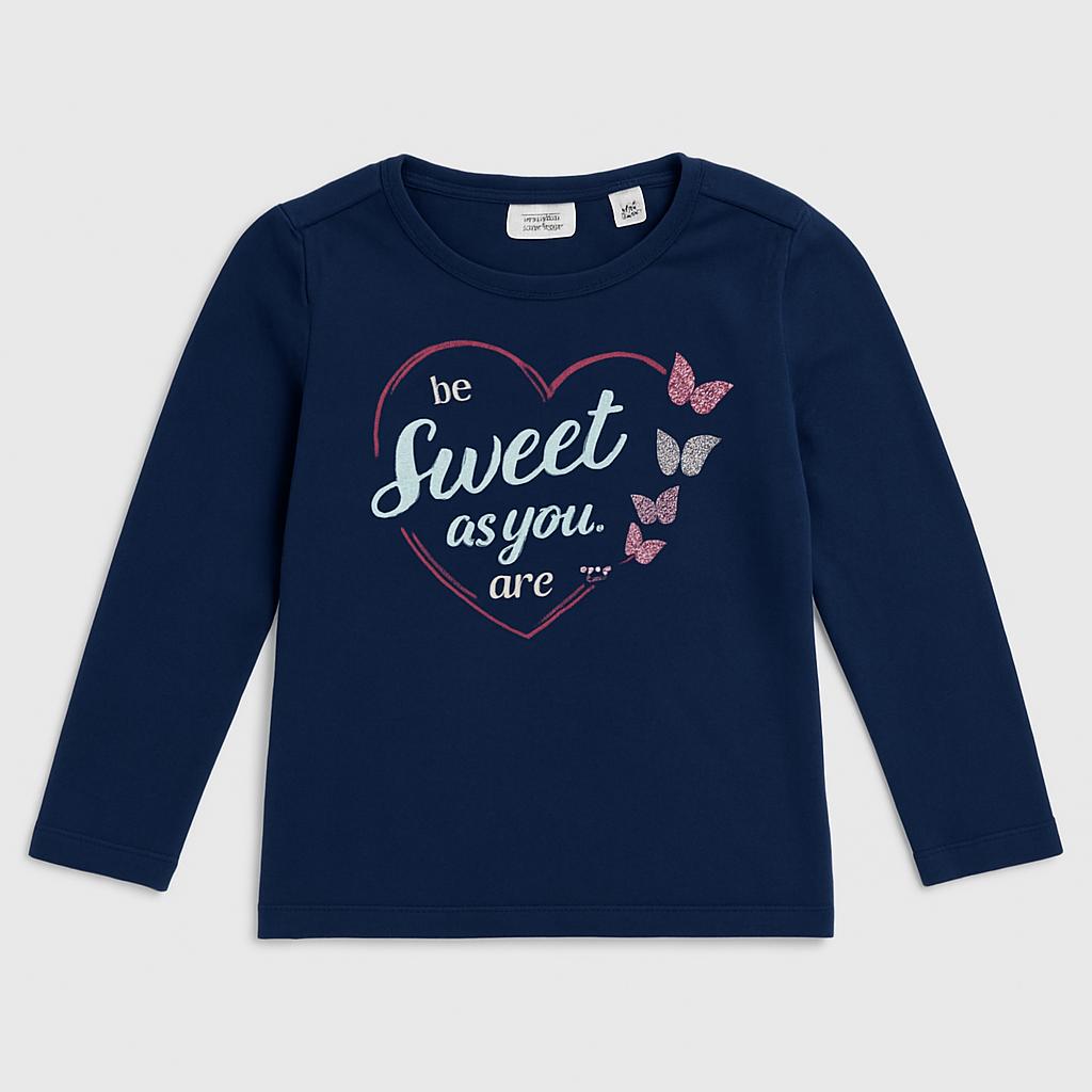 Questa deliziosa t-shirt a maniche lunghe è il capo perfetto per le piccole sognatrici! Di un elegante blu notte, presenta una dolce scritta "be sweet as you are" circondata da tenere farfalle colorate. Realizzata in morbido cotone, garantisce comfort durante tutta la giornata. Il taglio comodo e le maniche lunghe la rendono ideale per le fresche serate primaverili o le avventure quotidiane. Nonostante sia un capo usato, si trova in ottime condizioni, pronta ad aggiungere un tocco di dolcezza a qualsiasi outfit! Un must-have per le piccole fashioniste!