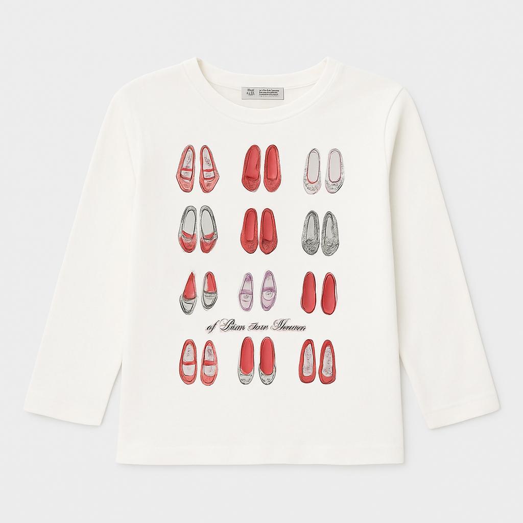 Questa adorabile t-shirt a maniche lunghe è perfetta per le piccole amanti della moda! Realizzata in morbido cotone bianco, presenta un divertente motivo di scarpe colorate su sfondo luminoso. Le scarpe stilizzate in tonalità di rosso e rosa aggiungono un tocco giocoso e femminile. Grazie al suo taglio comodo, è ideale per ogni occasione, dalle giornate in classe ai giochi all'aperto. Sebbene sia un capo usato, si presenta in ottime condizioni, pronto per essere indossato da una piccola trendsetter! Un elemento essenziale per un guardaroba vivace e alla moda!