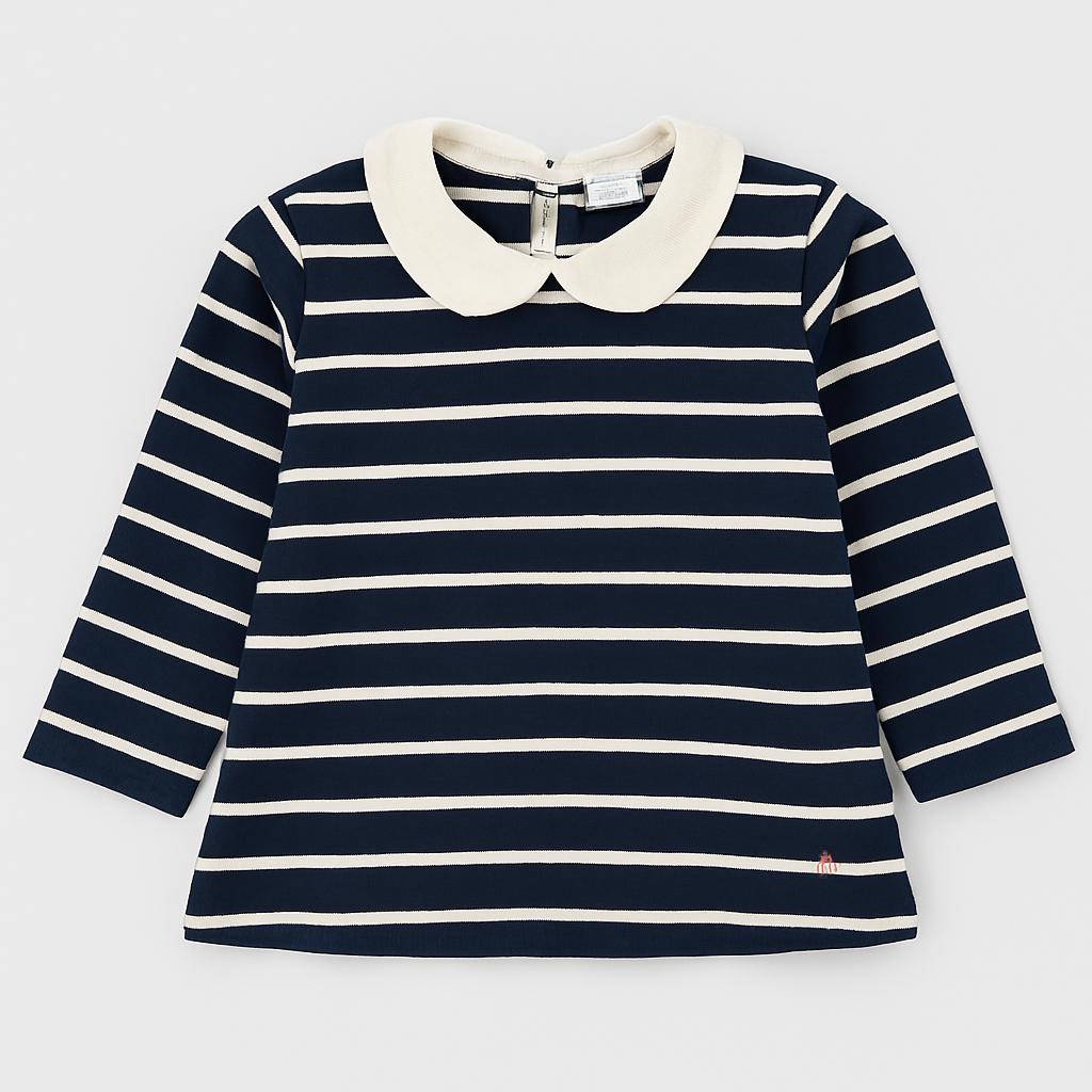 Questa deliziosa maglietta a righe è un capo intramontabile per le piccole fashioniste! Con un classico motivo a righe bianche e blu navy, è arricchita da un elegante colletto bianco che dona un tocco di raffinatezza. Le maniche lunghe la rendono perfetta per le giornate fresche, mentre il tessuto morbido garantisce comfort durante ogni avventura quotidiana. Nonostante sia un capo usato, si presenta in ottime condizioni, pronto a regalare stile e praticità al guardaroba della tua bambina. Un must-have per ogni piccola trendsetter!